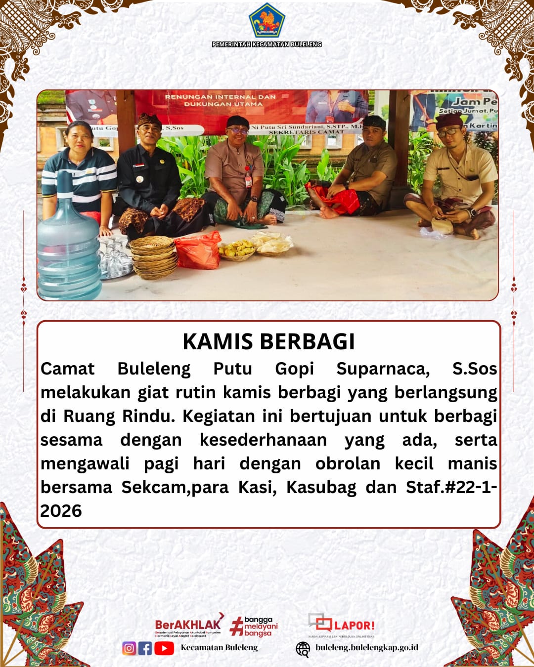 Buleleng — Kamis, 22 Januari 2026, Camat Buleleng Putu Gopi Suparnaca, S.Sos kembali melaksanakan kegiatan rutin Kamis Berbagi yang berlangsung di Ruang Rindu Kantor Camat Buleleng.
