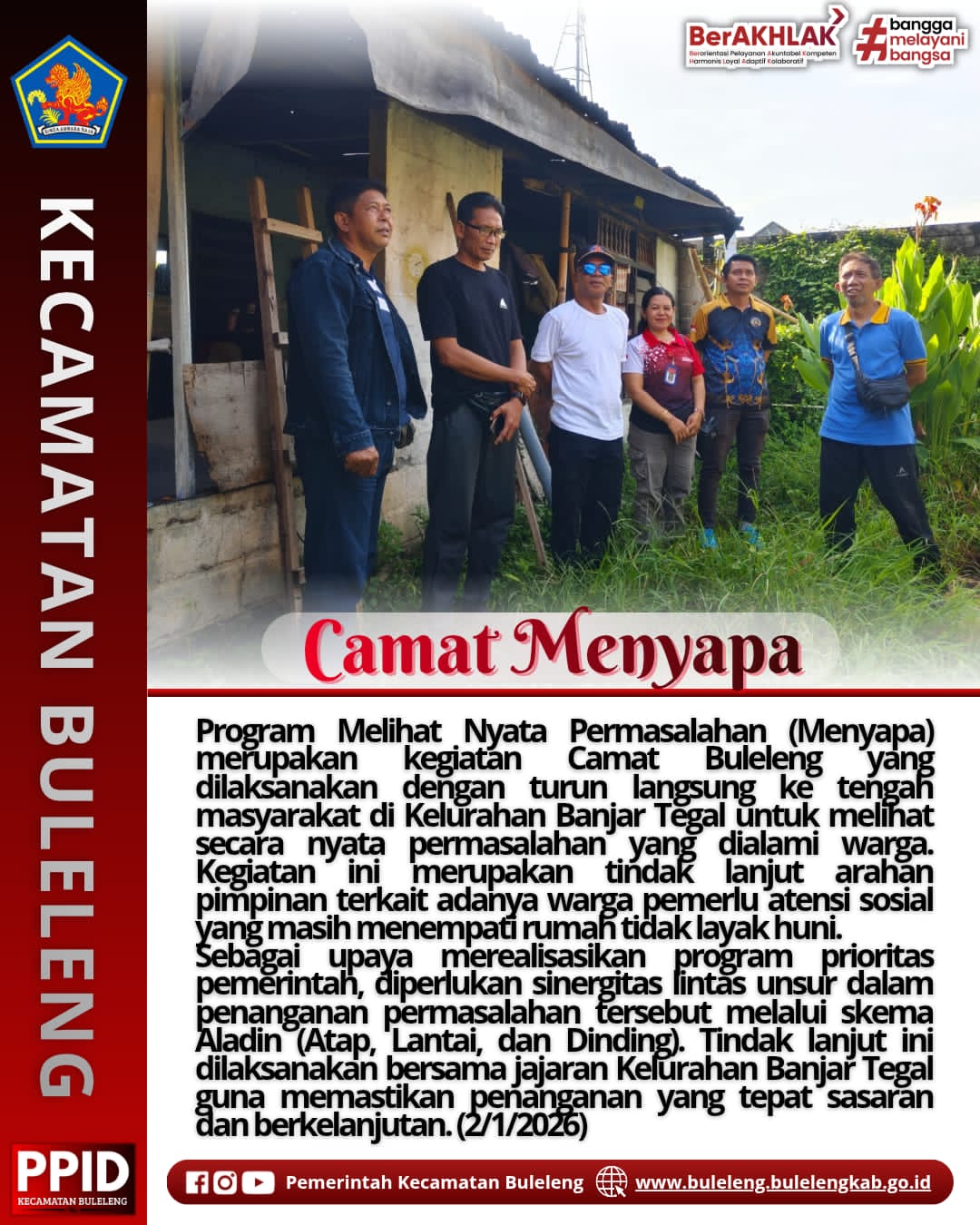 Dalam kesempatan tersebut, Camat Buleleng menegaskan bahwa penanganan permasalahan rumah tidak layak huni membutuhkan sinergitas lintas unsur, baik pemerintah kelurahan, kecamatan, maupun pihak terkait lainnya. Upaya penanganan diarahkan melalui skema ALADIN (Atap, Lantai, dan Dinding) sebagai bagian dari program prioritas pemerintah dalam meningkatkan kualitas hidup masyarakat.