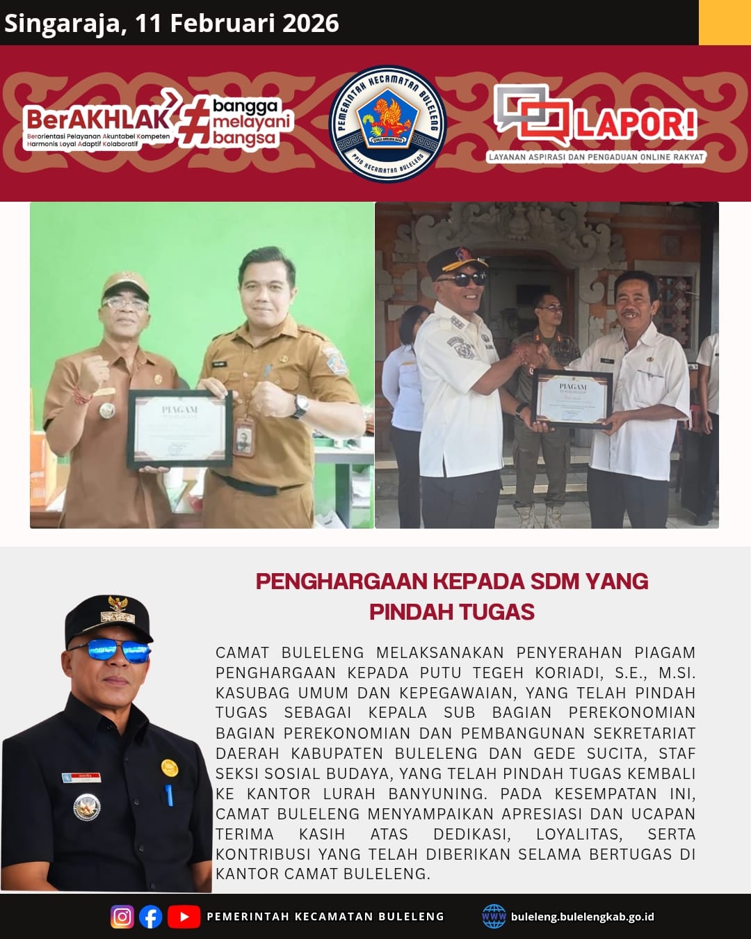 Pada kesempatan itu, Camat Buleleng menyampaikan apresiasi dan ucapan terima kasih atas dedikasi, loyalitas, serta kontribusi yang telah diberikan selama kurang lebih satu tahun bertugas di Kantor Camat Buleleng.