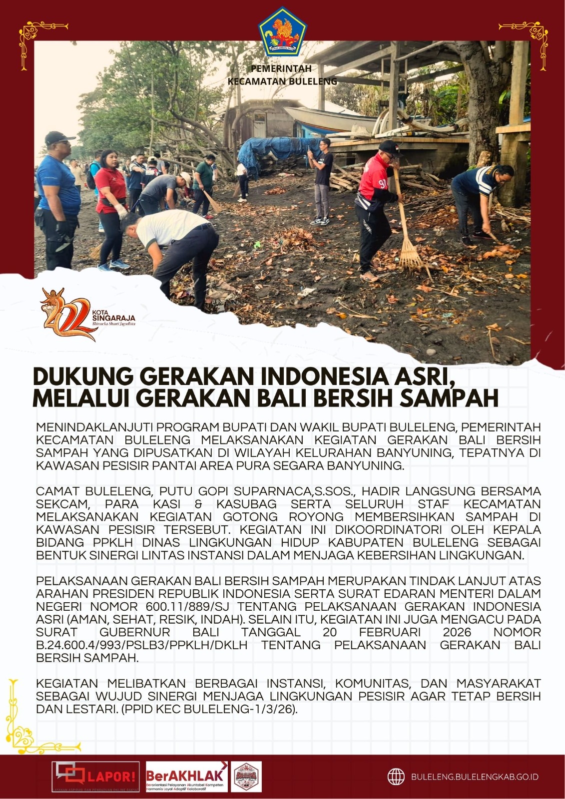 Camat Buleleng, Putu Gopi Suparnaca,S.Sos., hadir langsung bersama Sekcam, para kasi dan kasubag serta seluruh staf kecamatan melaksanakan kegiatan gotong royong membersihkan sampah di kawasan pesisir tersebut. Kegiatan ini dikoordinatori oleh Kepala Bidang PPKLH Dinas Lingkungan Hidup Kabupaten Buleleng sebagai bentuk sinergi lintas instansi dalam menjaga kebersihan lingkungan.