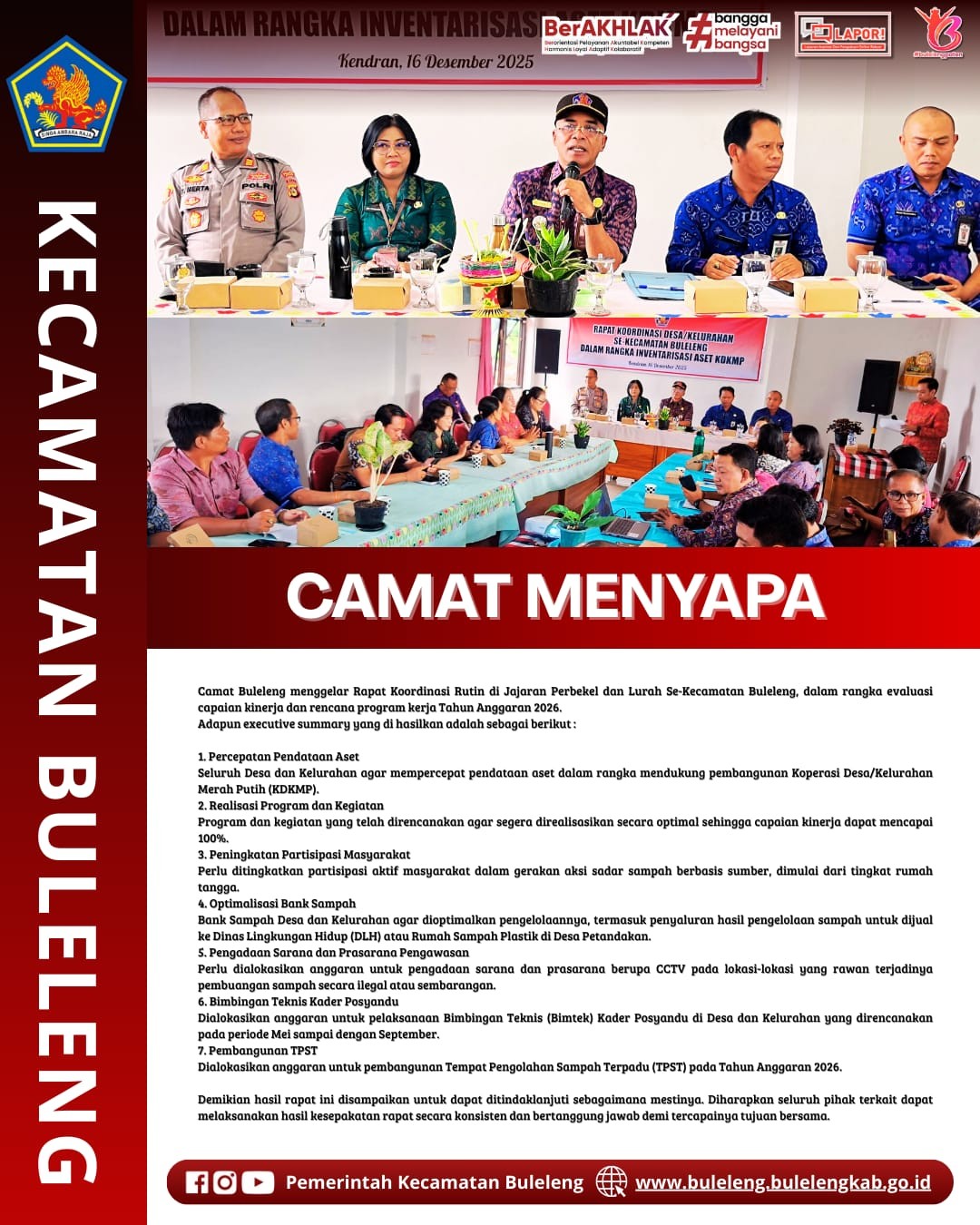 Kehadiran Camat Buleleng beserta jajaran disambut oleh Lurah Kendran Made Sumardika. Rapat koordinasi ini difokuskan pada pembahasan inventarisasi aset dalam rangka mendukung pelaksanaan Koperasi Desa/Kelurahan Merah Putih (KDKMP).