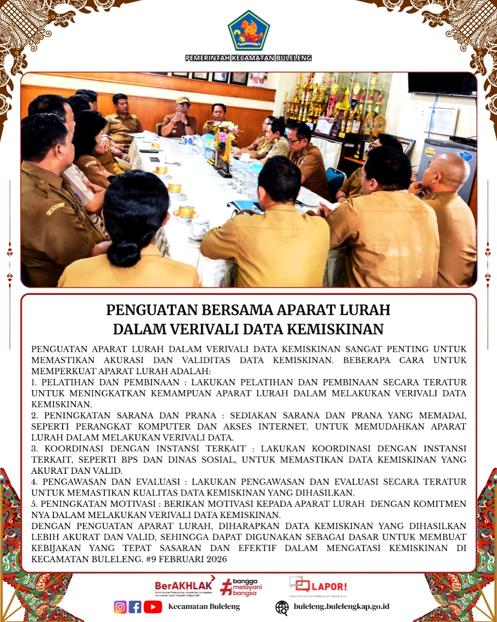Dengan penguatan aparat lurah ini, diharapkan data kemiskinan di Kecamatan Buleleng semakin akurat dan valid, sehingga dapat menjadi dasar penyusunan kebijakan yang tepat sasaran dan efektif dalam upaya penanggulangan kemiskinan.