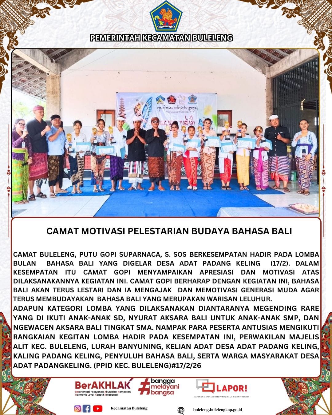 Buleleng — Camat Buleleng, Putu Gopi Suparnaca,S.Sos, berkesempatan hadir pada kegiatan Lomba Bulan Bahasa Bali yang digelar Desa Adat Padang Keling, Selasa (17/2). Dalam kesempatan tersebut, Camat Gopi menyampaikan apresiasi serta motivasi atas terselenggaranya kegiatan ini.