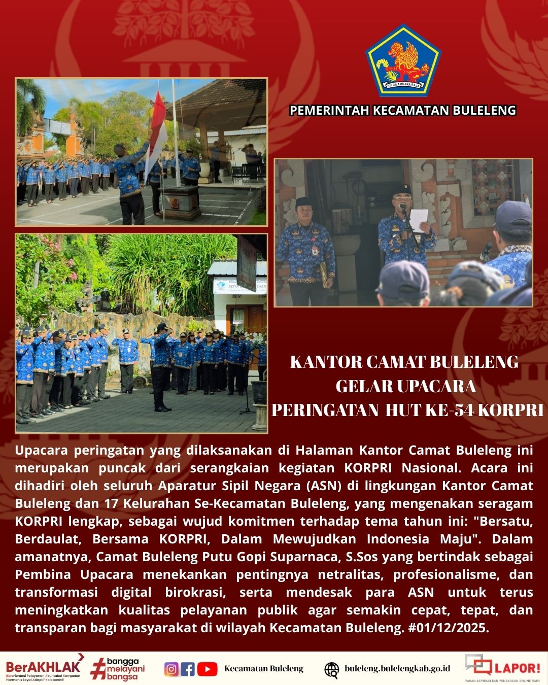 Buleleng, Senin 1 Desember 2025 — Dalam suasana pagi yang khidmat dan penuh rasa kebersamaan, Camat Buleleng Putu Gopi Suparnaca, S.Sos memimpin upacara peringatan Hari Ulang Tahun Korps Pegawai Republik Indonesia (KORPRI) ke-54 yang digelar di halaman Kantor Camat Buleleng.