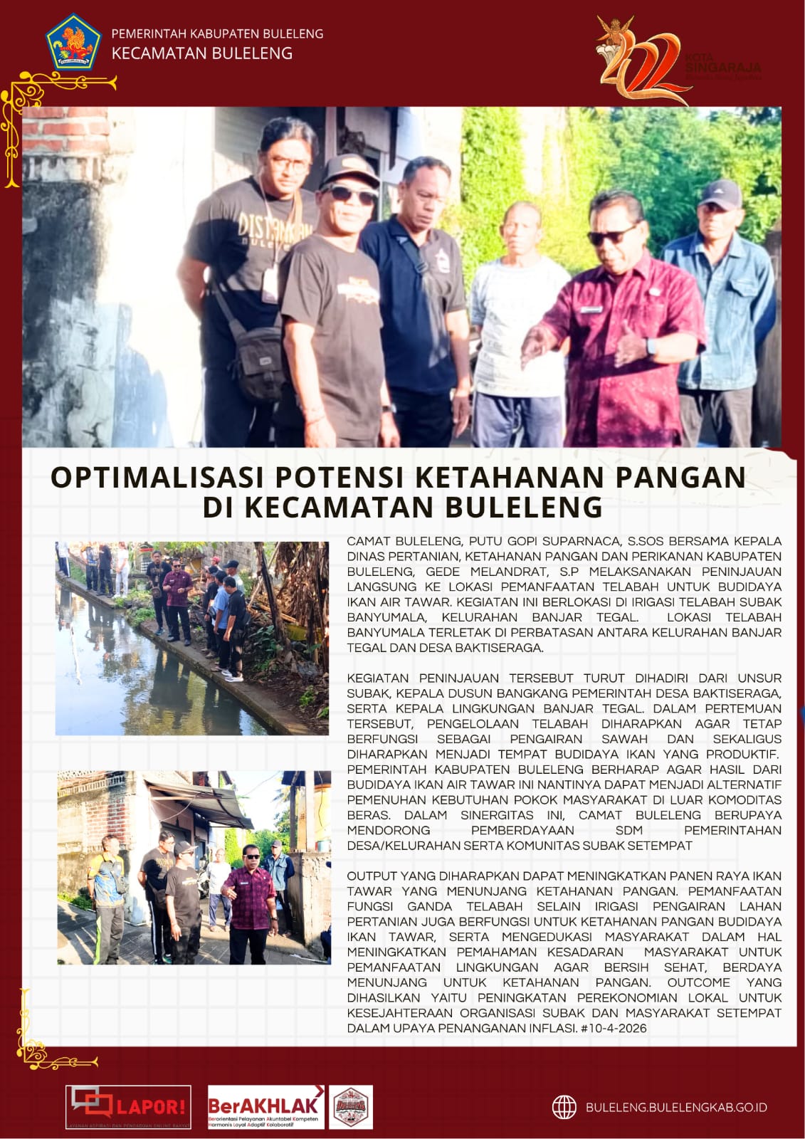 Output yang diharapkan dapat meningkatkan panen raya ikan tawar yang menunjang ketahanan pangan. Pemanfaatan fungsi ganda telabah selain irigasi pengairan lahan pertanian juga berfungsi untuk ketahanan pangan budidaya ikan tawar, serta mengedukasi masyarakat dalam hal meningkatkan pemahaman kesadaran masyarakat untuk pemanfaatan lingkungan agar bersih, sehat, berdaya, dan menunjang ketahanan pangan. Outcome yang dihasilkan yaitu peningkatan perekonomian lokal untuk kesejahteraan organisasi subak dan masyarakat setempat dalam upaya penanganan inflasi. (PPID Kec.Buleleng, 10/4/2026).