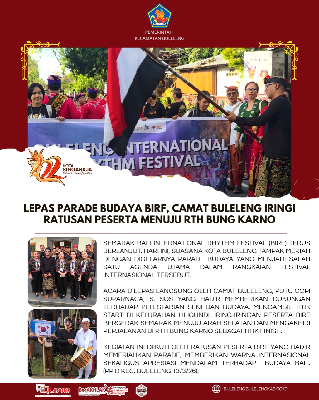 Semarak Bali International Rhythm Festival (BIRF) terus berlanjut. Hari ini, suasana Kota Buleleng tampak meriah dengan digelarnya parade budaya yang menjadi salah satu agenda utama dalam rangkaian festival internasional tersebut.