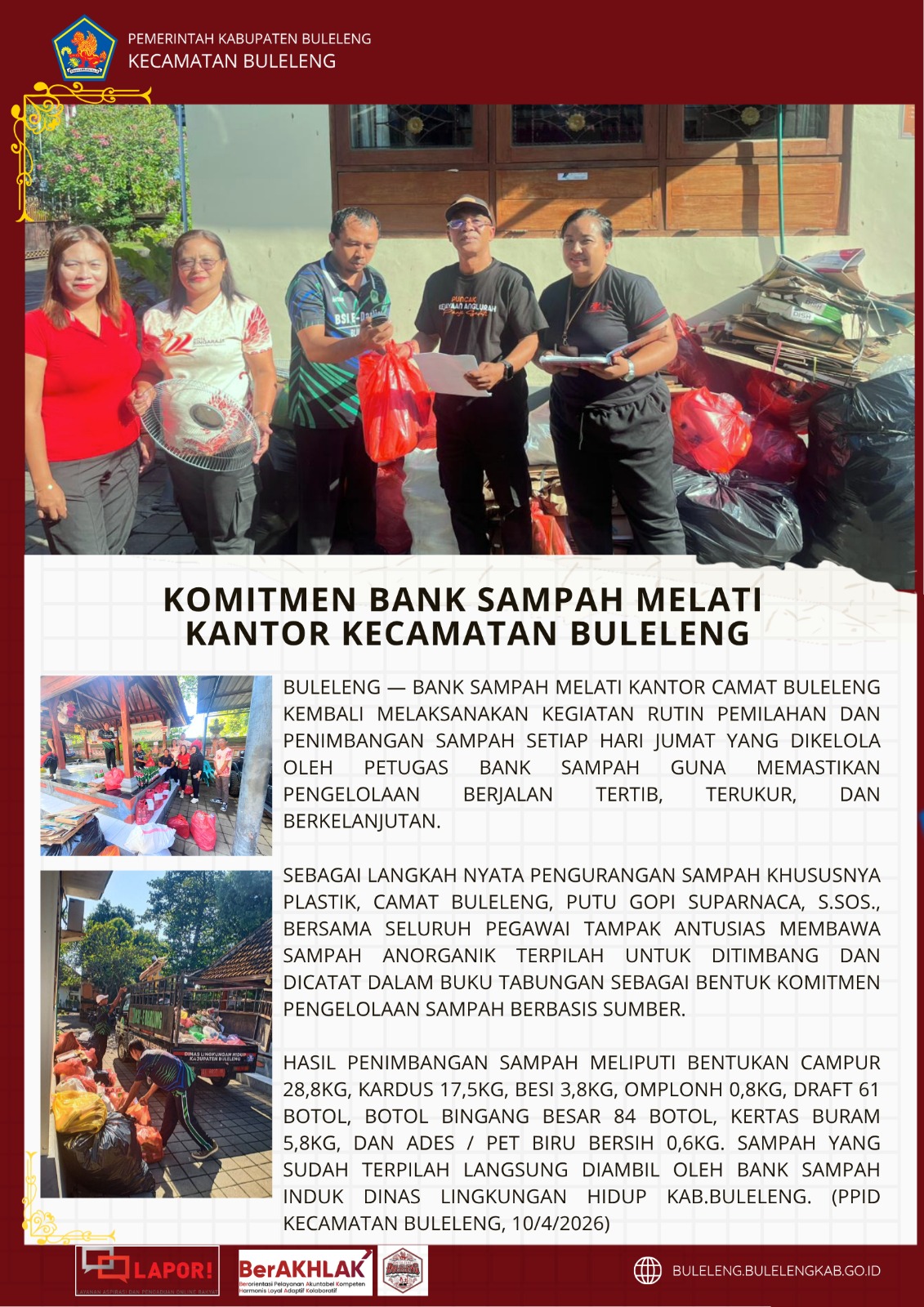 Hasil penimbangan sampah meliputi bentukan campur 28,8 kg, kardus 17,5 kg, besi 3,8 kg, omplonh 0,8 kg, draft 61 botol, botol bingang besar 84 botol, kertas buram 5,8 kg, dan ades PET biru bersih 0,6 kg. Sampah yang sudah terpilah langsung diambil oleh Bank Sampah Induk Dinas Lingkungan Hidup Kab. Buleleng. (PPID Kecamatan Buleleng, 10/4/2026)