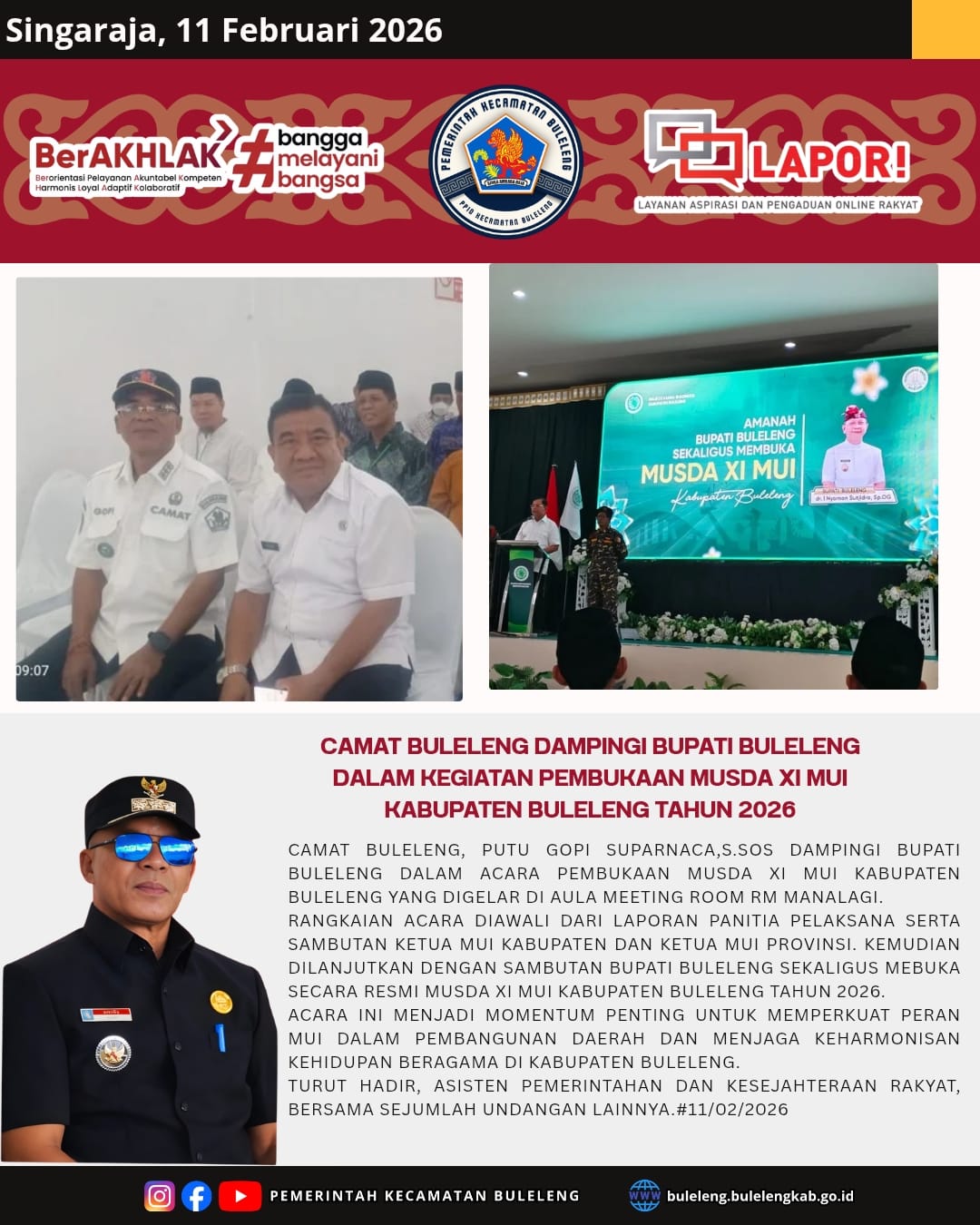 Camat Buleleng, Putu Gopi Suparnaca, S.Sos dampingi Bupati Buleleng dalam acara pembukaan Musda XI MUI Kabupaten Buleleng yang digelar di Aula Meeting Room RM Manalagi (10/2).