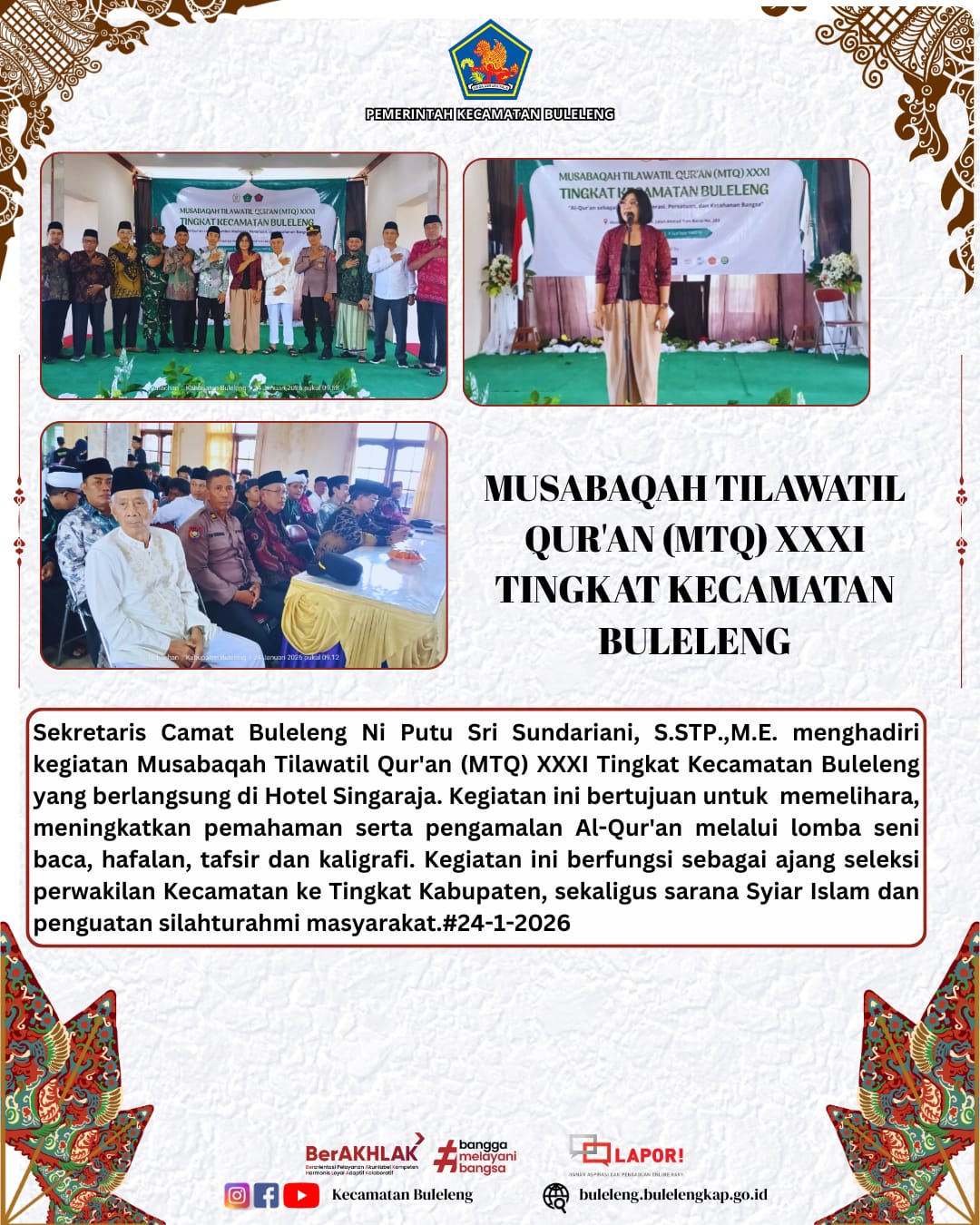 Buleleng – Musabaqah Tilawatil Qur’an (MTQ) XXXI Tingkat Kecamatan Buleleng resmi digelar pada Sabtu, 24 Januari 2026, bertempat di Hotel Singaraja. Kegiatan ini dihadiri oleh Sekretaris Camat Buleleng, Ni Putu Sri Sundariani, S.STP., M.E., sebagai perwakilan Pemerintah Kecamatan Buleleng.