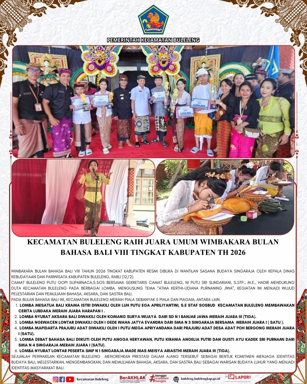KECAMATAN BULELENG RAIH JUARA UMUM WIMBAKARA BULAN BAHASA BALI VIII TINGKAT KABUPATEN TAHUN 2026