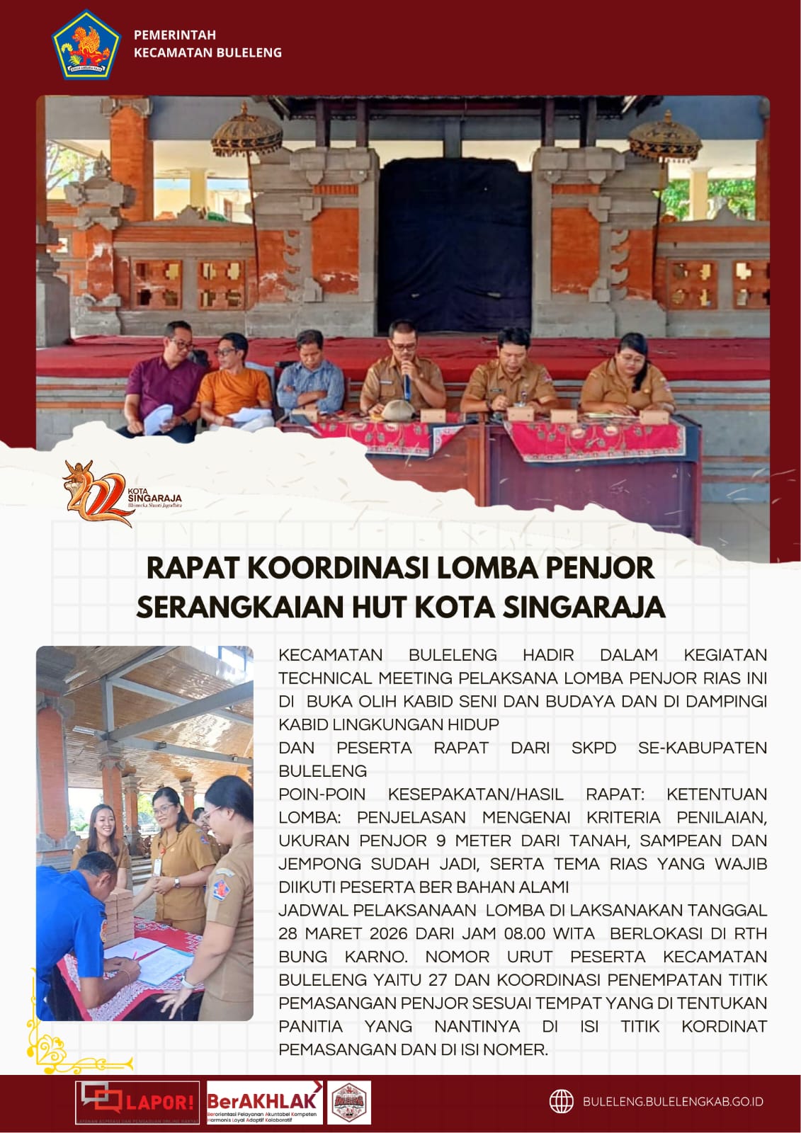 Kecamatan Buleleng hadir dalam kegiatan technical meeting pelaksana lomba penjor rias. Kegiatan ini dibuka oleh Kabid Seni dan Budaya dan didampingi Kabid Lingkungan Hidup. Peserta rapat berasal dari SKPD se-Kabupaten Buleleng. Poin-poin kesepakatan/hasil rapat: