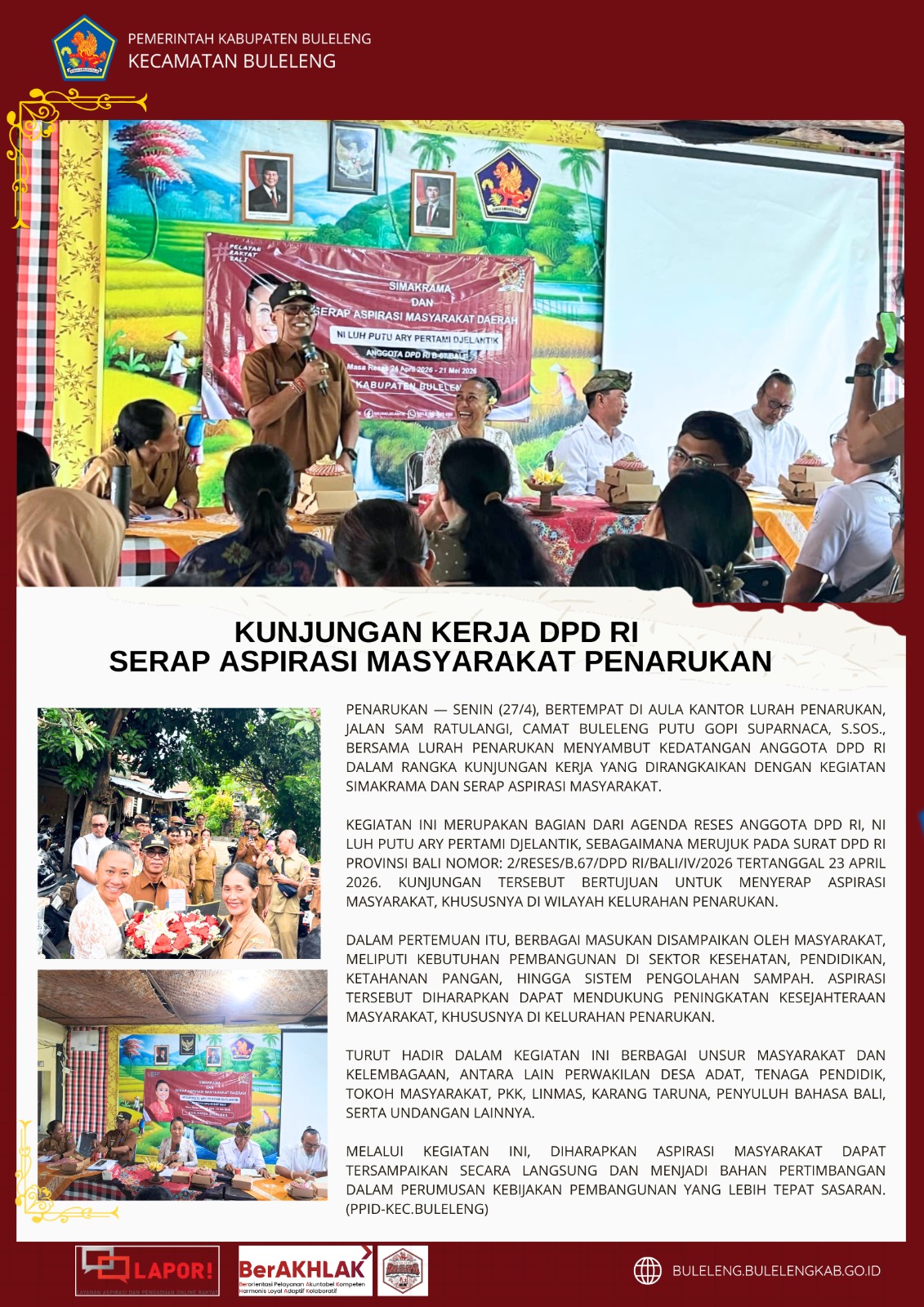 Kegiatan ini merupakan bagian dari agenda reses Anggota DPD RI, Ni Luh Putu Ary Pertami Djelantik, sebagaimana merujuk pada surat DPD RI Provinsi Bali Nomor: 2/Reses/B.67/DPD RI/Bali/IV/2026 tertanggal 23 April 2026. Kunjungan tersebut bertujuan untuk menyerap aspirasi masyarakat, khususnya di wilayah Kelurahan Penarukan.