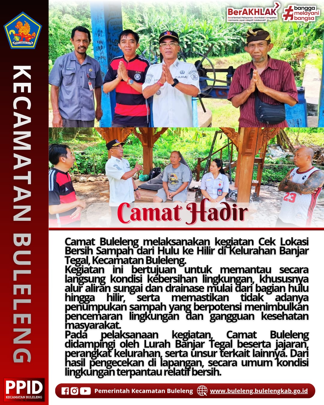 Buleleng, Rabu (31/12/2025) — Dalam rangka mendukung upaya pelestarian lingkungan serta pengendalian permasalahan sampah secara berkelanjutan, Camat Buleleng Putu Gopi Suparnaca, S.Sos melaksanakan kegiatan Cek Lokasi Bersih Sampah dari Hulu ke Hilir yang berlokasi di Kelurahan Banjar Tegal, Kecamatan Buleleng.