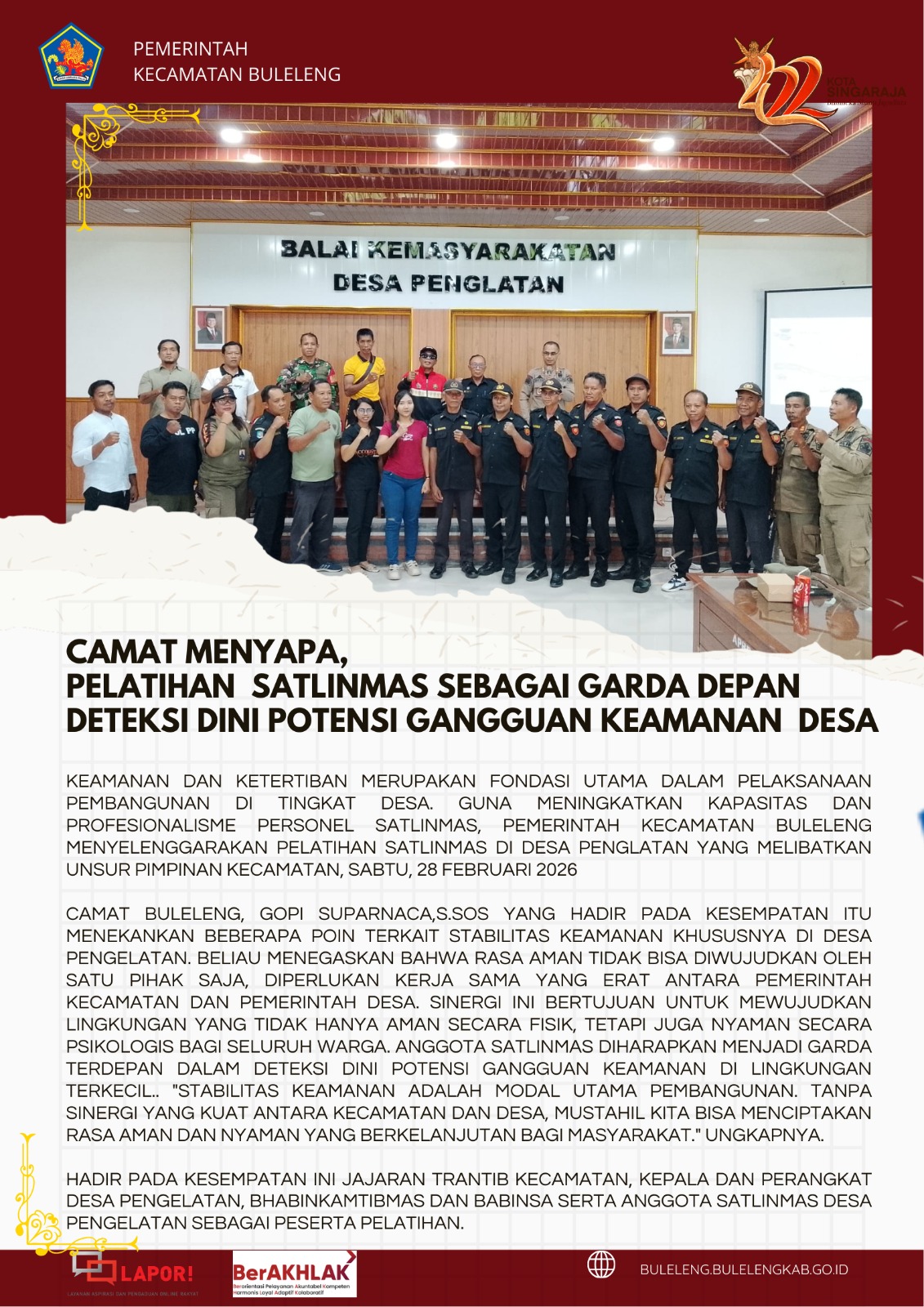Keamanan dan ketertiban merupakan fondasi utama dalam pelaksanaan pembangunan di tingkat desa. Guna meningkatkan kapasitas dan profesionalisme personel Satlinmas, Pemerintah Kecamatan Buleleng menyelenggarakan pelatihan Satlinmas di Desa Penglatan yang melibatkan unsur pimpinan kecamatan, Sabtu, 28 Februari 2026.