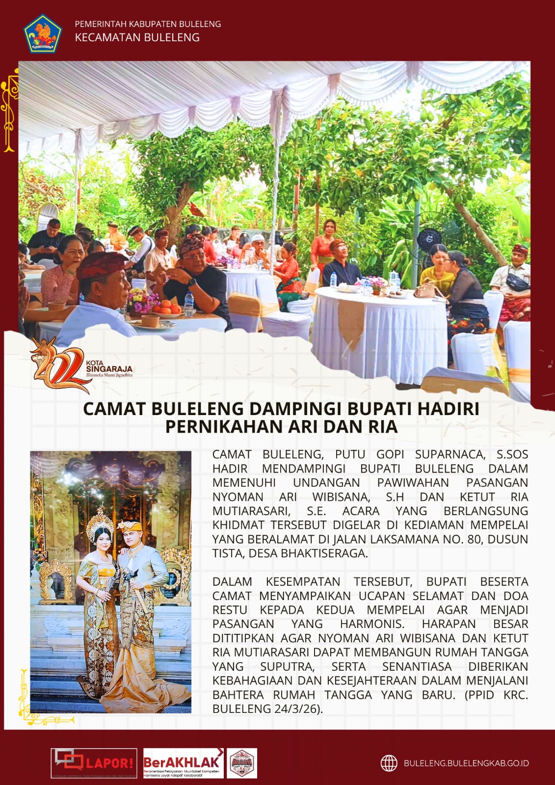 Dalam kesempatan tersebut, Bupati beserta Camat menyampaikan ucapan selamat dan doa restu kepada kedua mempelai agar menjadi pasangan yang harmonis. Harapan besar dititipkan agar Nyoman Ari Wibisana dan Ketut Ria Mutiarasari dapat membangun rumah tangga yang suputra, serta senantiasa diberikan kebahagiaan dan kesejahteraan dalam menjalani bahtera rumah tangga yang baru. (PPID Kec. Buleleng 24/3/26).