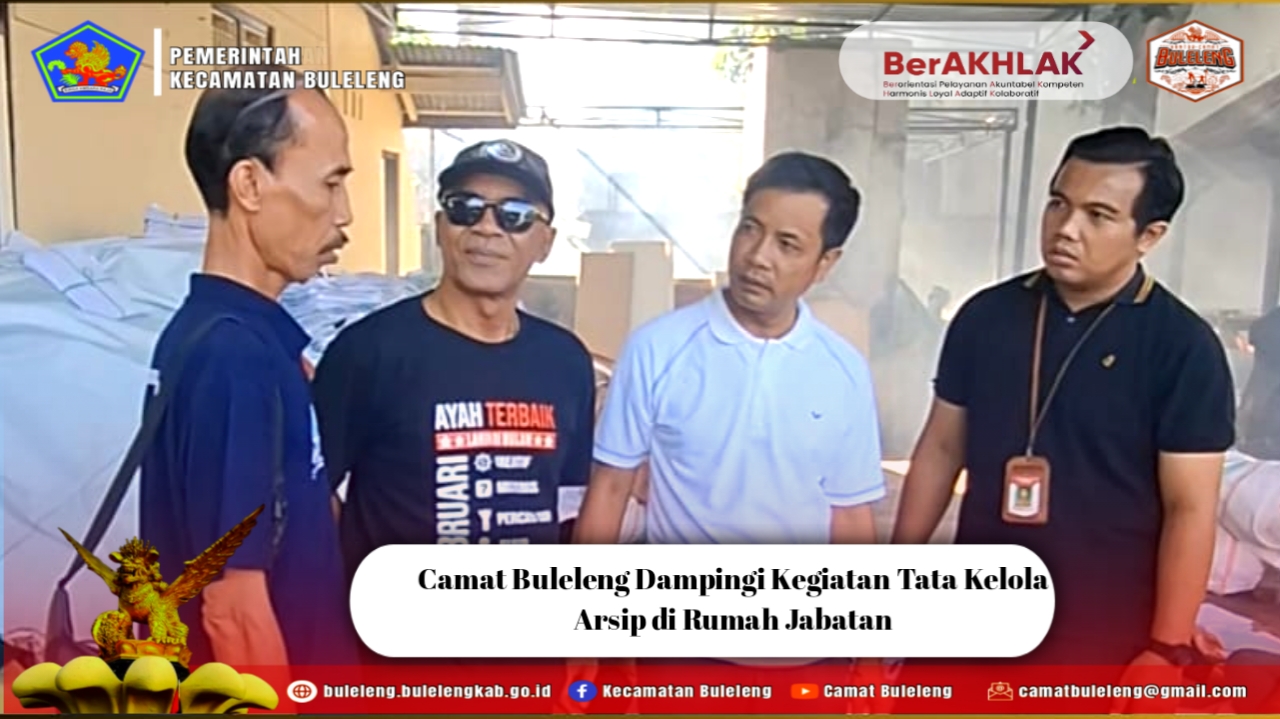 Buleleng, Jumat (7 November 2025) – Camat Buleleng, Putu Gopi Suparnaca, S.Sos, hadir mendampingi staf Kecamatan Buleleng dalam kegiatan Tata Kelola Arsip yang dilaksanakan di Rumah Jabatan Camat Buleleng. Kegiatan ini bertujuan untuk meningkatkan kesadaran dan kemampuan aparatur dalam pengelolaan arsip yang baik, tertib, dan sesuai ketentuan.