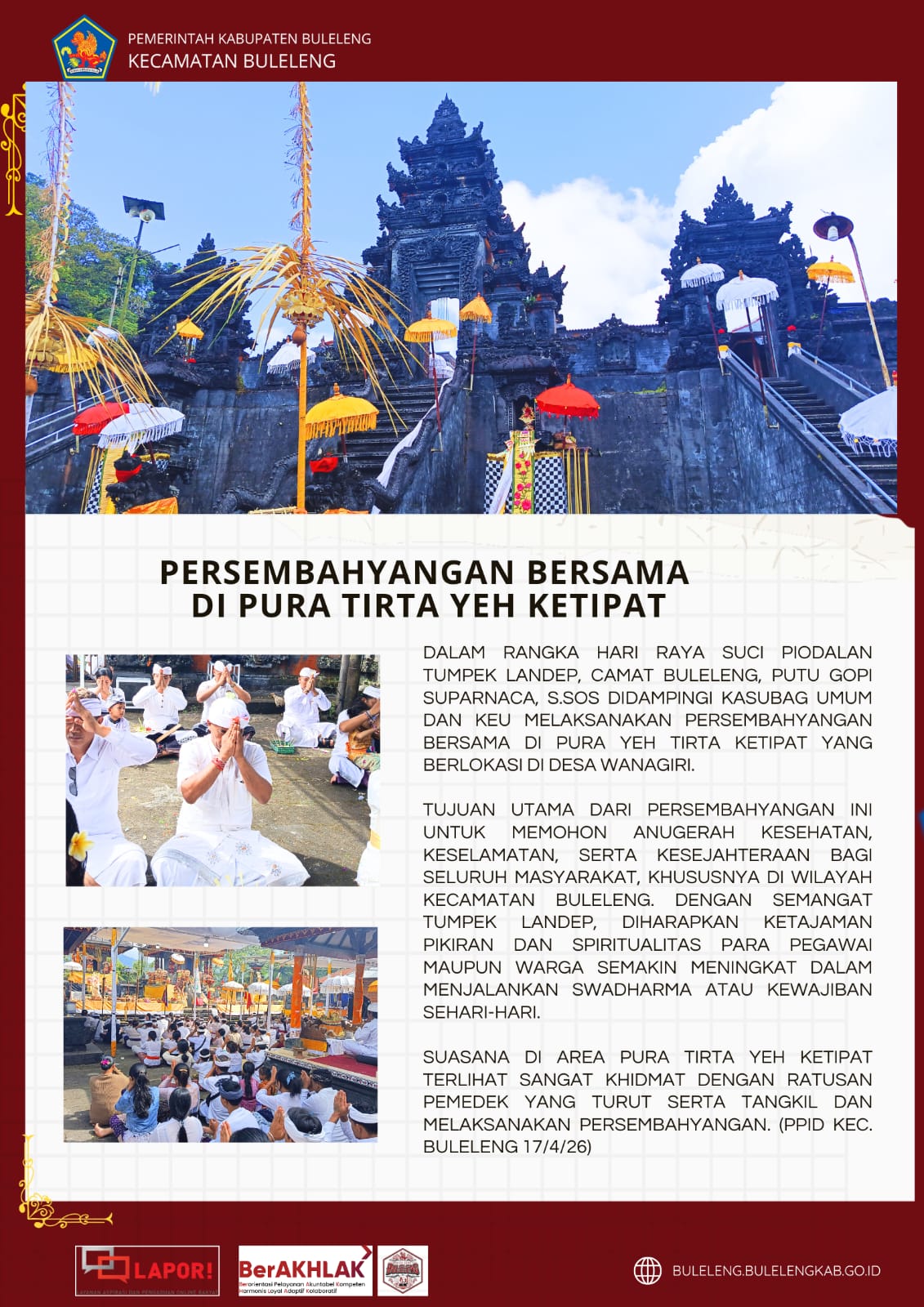 Suasana di area Pura Tirta Yeh Ketipat terlihat sangat khidmat dengan ratusan pemedek yang turut serta tangkil dan melaksanakan persembahyangan. (PPID Kec. Buleleng 17/4/26)