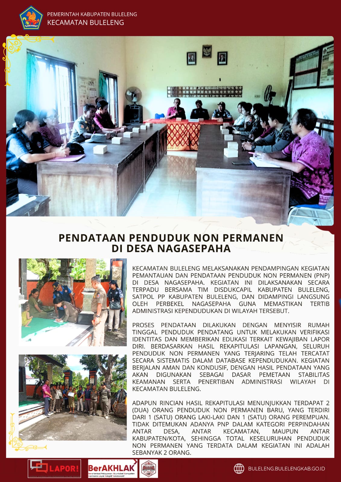 Proses pendataan dilakukan dengan menyisir rumah tinggal penduduk pendatang untuk melakukan verifikasi identitas dan memberikan edukasi terkait kewajiban lapor diri, berdasarkan hasil rekapitulasi lapangan, seluruh penduduk non permanen yang terjaring telah tercatat secara sistematis dalam database kependudukan. Kegiatan berjalan aman dan kondusif, dengan hasil pendataan yang akan digunakan sebagai dasar pemetaan stabilitas keamanan serta penertiban administrasi wilayah di Kecamatan Buleleng.