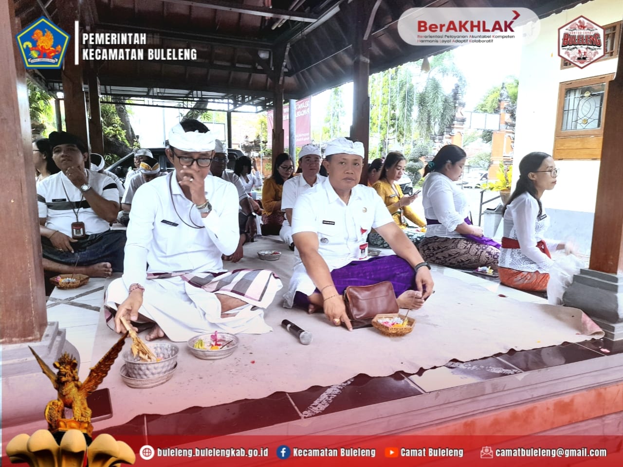 Setiap rahina suci Punama dan rahina suci tilem, mengawali aktivitas kerja dilaksanakan persembahyangan bersama. Hal ini bertujuan untuk memohon keselamatan serta lindungan Ida Sang Hyang Widi Wasa di dalam mengawali melaksanakan aktivitas kerja, sebelum tugas dilaksanakan sebagaimana biasa di Kantor Camat Buleleng. Juga mengucapkan rasa syukur tentang apa yang telah dicapai dan akan dilaksanakan dalam mejalankan tugas- tugas sesuai Tupoksi masing – masing.