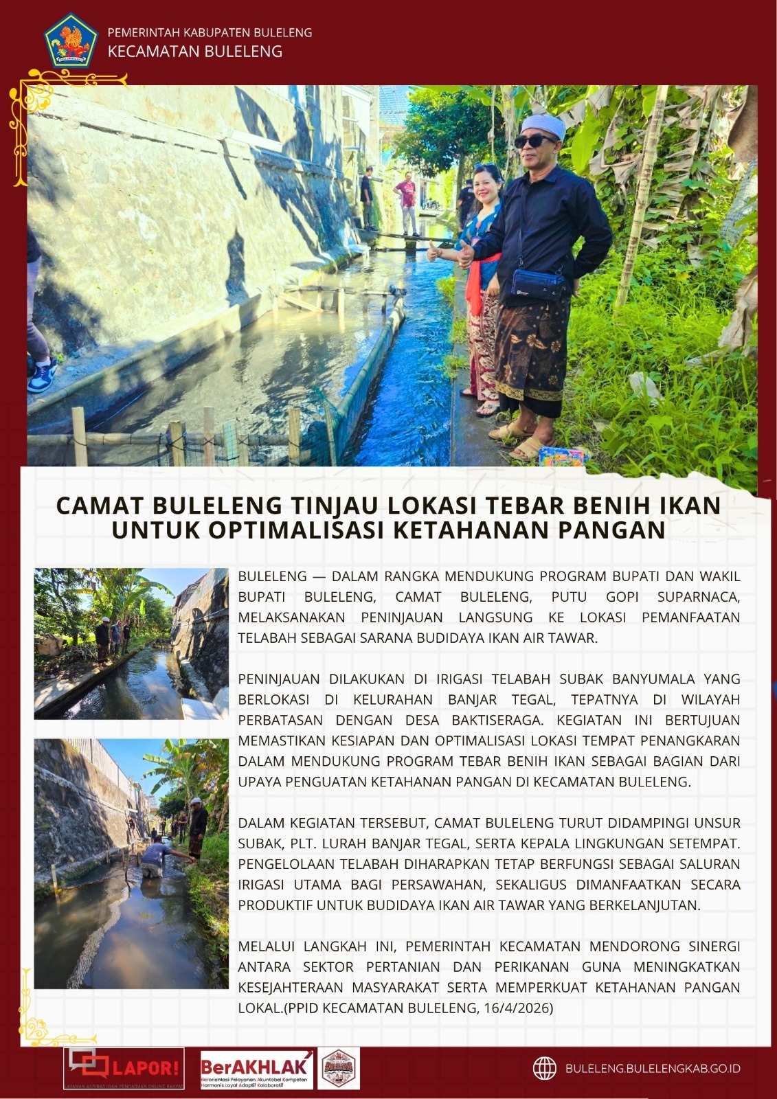 Melalui langkah ini, Pemerintah Kecamatan mendorong sinergi antara sektor pertanian dan perikanan guna meningkatkan kesejahteraan masyarakat serta memperkuat ketahanan pangan lokal. (PPID Kecamatan Buleleng, 16/4/2026)