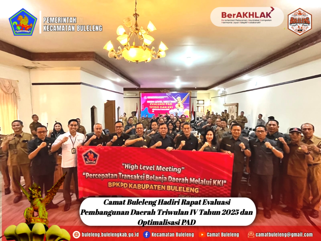 Senin, 15 Desember 2025, pukul 08.00 WITA, Camat Buleleng Putu Gopi Suparnaca, S.Sos menghadiri Rapat Evaluasi Pelaksanaan Program Kegiatan Pembangunan Daerah Triwulan IV Tahun 2025 yang dirangkaikan dengan agenda Optimalisasi Pendapatan Asli Daerah (PAD), serta Evaluasi Pelaksanaan Program Tim Percepatan dan Perluasan Digitalisasi Daerah (TP2DD) dan Kartu Kredit Indonesia (KKI).