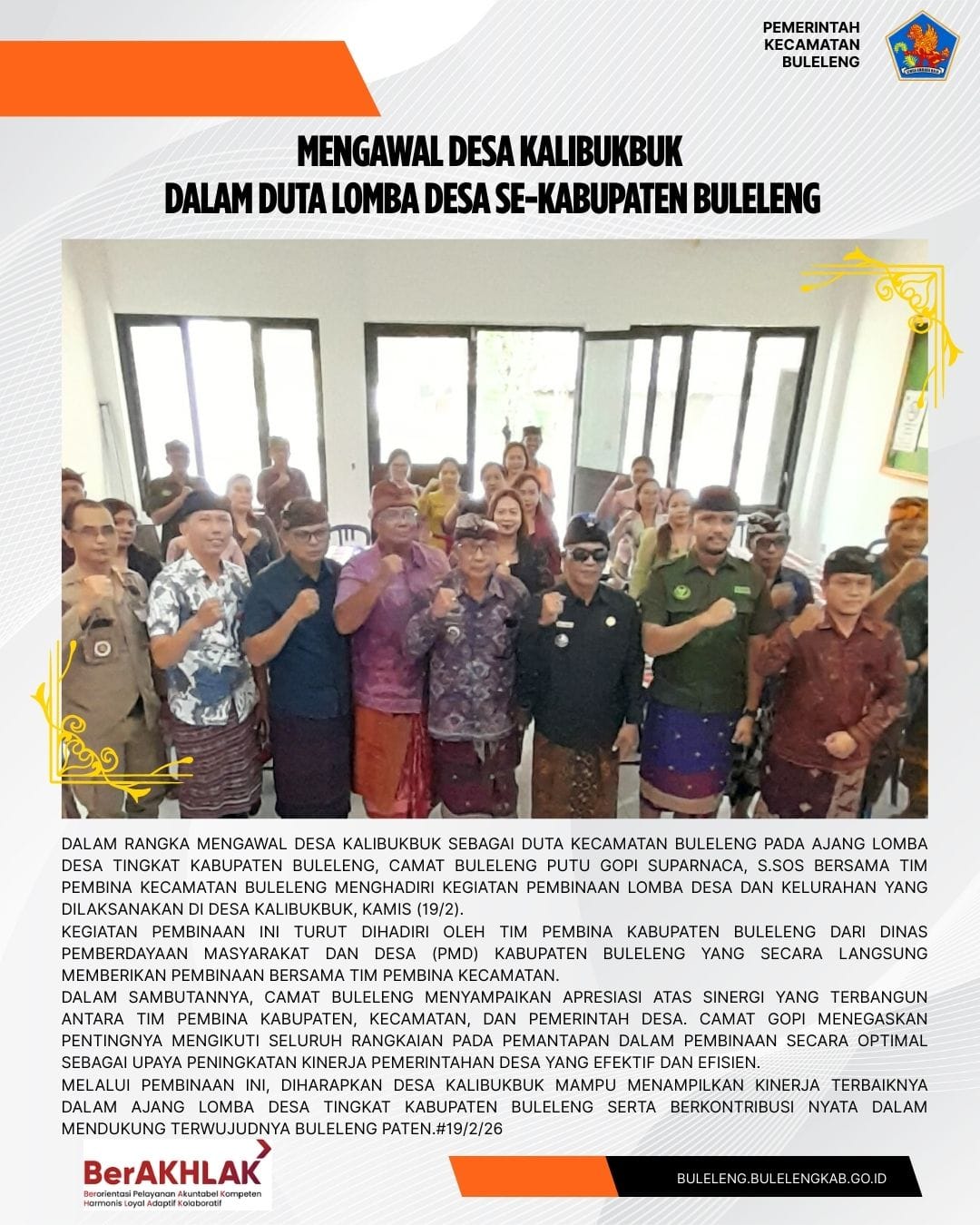 Dalam rangka mengawal Desa Kalibukbuk sebagai duta Kecamatan Buleleng pada ajang Lomba Desa tingkat Kabupaten Buleleng, Camat Buleleng Putu Gopi Suparnaca, S.Sos bersama Tim Pembina Kecamatan Buleleng menghadiri kegiatan pembinaan lomba desa dan kelurahan yang dilaksanakan di Desa Kalibukbuk, Kamis (19/2).