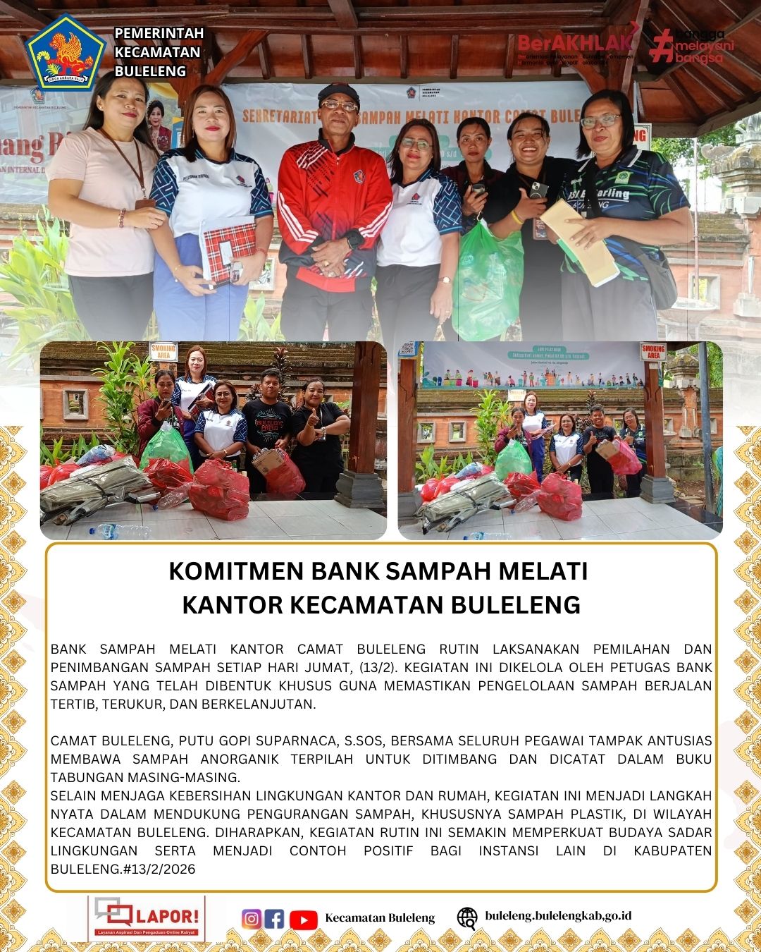 Buleleng, Jumat (13/2/2026) — Bank Sampah Melati Kantor Camat Buleleng kembali melaksanakan kegiatan rutin pemilahan dan penimbangan sampah setiap hari Jumat yang dikelola oleh petugas bank sampah guna memastikan pengelolaan berjalan tertib, terukur, dan berkelanjutan.