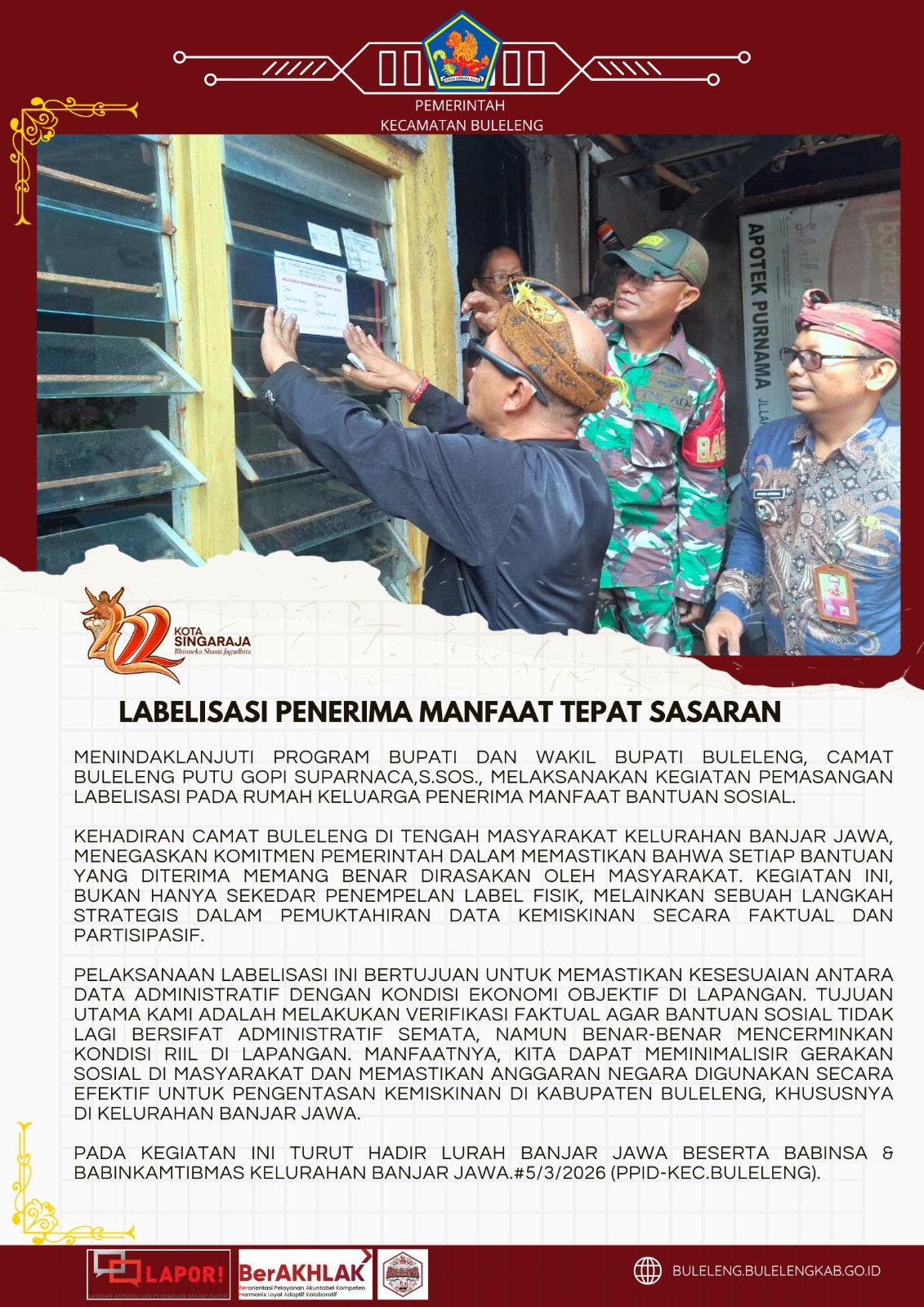 Kehadiran Camat Buleleng di tengah masyarakat Kelurahan Banjar Jawa menegaskan komitmen pemerintah dalam memastikan bahwa setiap bantuan yang diterima memang benar dirasakan oleh masyarakat. Kegiatan ini bukan hanya sekedar penempelan label fisik, melainkan sebuah langkah strategis dalam pemuktahiran data kemiskinan secara faktual dan partisipasif.