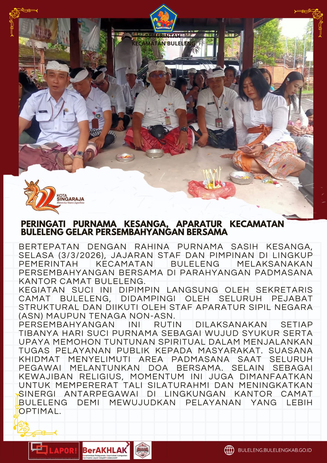 Bertepatan dengan Rahina Purnama Sasih Kesanga, Selasa (3/3/2026), jajaran staf dan pimpinan di lingkup Pemerintah Kecamatan Buleleng melaksanakan persembahyangan bersama di Parahyangan Padmasana Kantor Camat Buleleng.