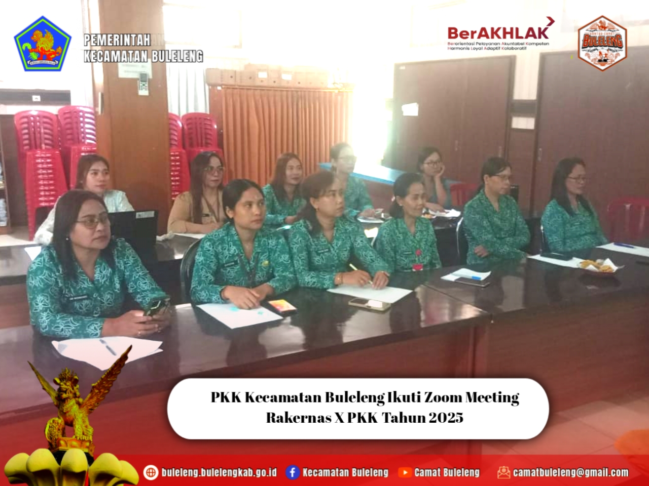 Buleleng, Kamis 30 Oktober 2025 – Tim Penggerak PKK Kecamatan Buleleng mengikuti Zoom Meeting Rapat Kerja Nasional (Rakernas) X PKK Tahun 2025 yang diselenggarakan dengan agenda utama membahas dan menyepakati tiga materi pokok, yaitu: Rencana Induk Gerakan PKK Tahun 2025–2029, Strategi Gerakan PKK, dan Petunjuk Teknis Tata Kelola Kelembagaan Gerakan PKK.