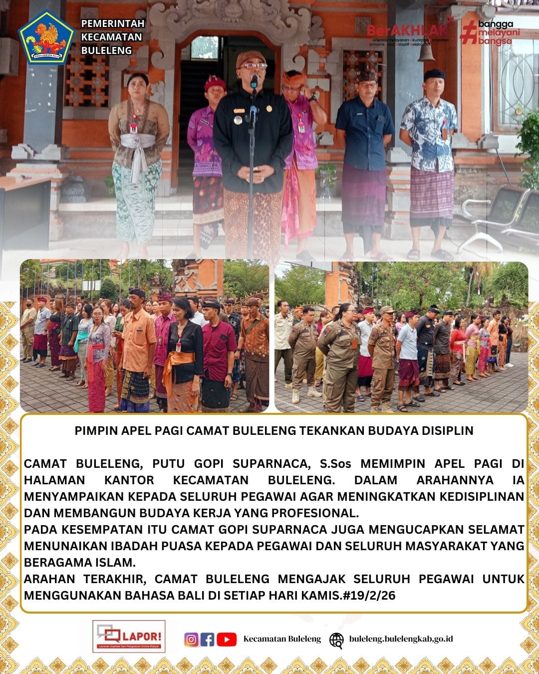 Camat Buleleng, Putu Gopi Suparnaca,S.Sos memimpin apel pagi di halaman Kantor Kecamatan Buleleng. Dalam arahannya, ia menyampaikan kepada seluruh pegawai agar meningkatkan kedisiplinan dan membangun budaya kerja yang profesional.
