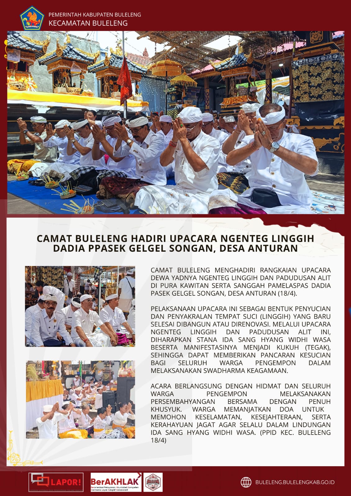 Camat Buleleng menghadiri rangkaian upacara Dewa Yadnya Ngenteg Linggih dan Padudusan Alit di Pura Kawitan serta Sanggah Pamelaspas Dadia Pasek Gelgel Songan, Desa Anturan (18/4).