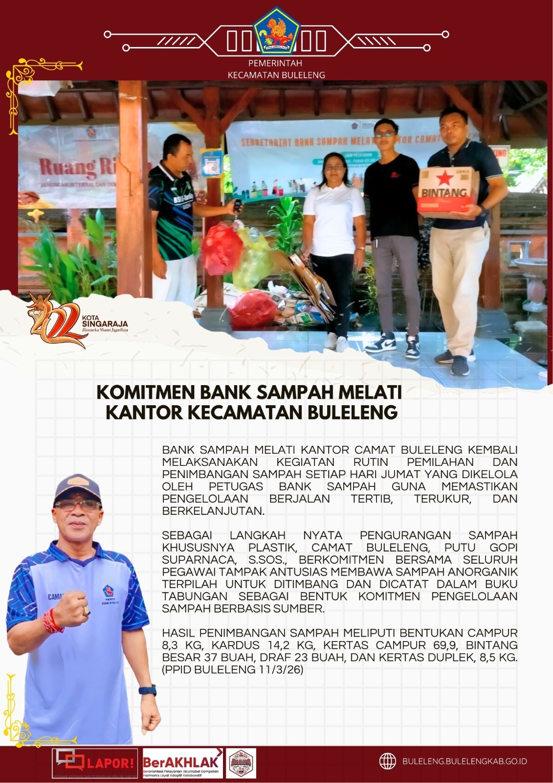 Sebagai langkah nyata pengurangan sampah khususnya plastik, Camat Buleleng, Putu Gopi Suparnaca,S.Sos., berkomitmen bersama seluruh pegawai tampak antusias membawa sampah anorganik terpilah untuk ditimbang dan dicatat dalam buku tabungan sebagai bentuk komitmen pengelolaan sampah berbasis sumber.