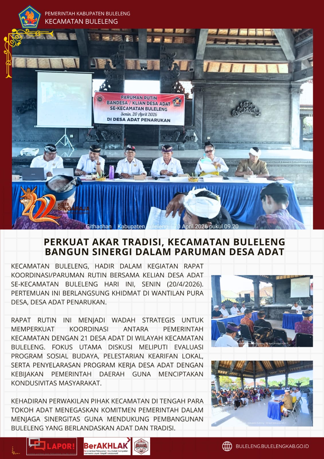 Kecamatan Buleleng, hadir dalam kegiatan rapat koordinasi/paruman rutin bersama kelian desa adat se-Kecamatan Buleleng hari ini, Senin (20/4/2026). Pertemuan ini berlangsung khidmat di Wantilan Pura Desa, Desa Adat Penarukan.