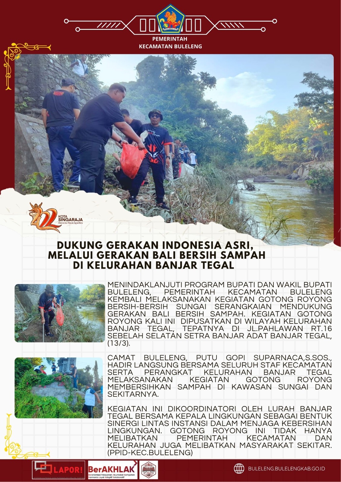 Camat Buleleng, Putu Gopi Suparnaca,S.Sos., hadir langsung bersama seluruh staf kecamatan serta perangkat Kelurahan Banjar Tegal melaksanakan kegiatan gotong royong membersihkan sampah di kawasan sungai dan sekitarnya.