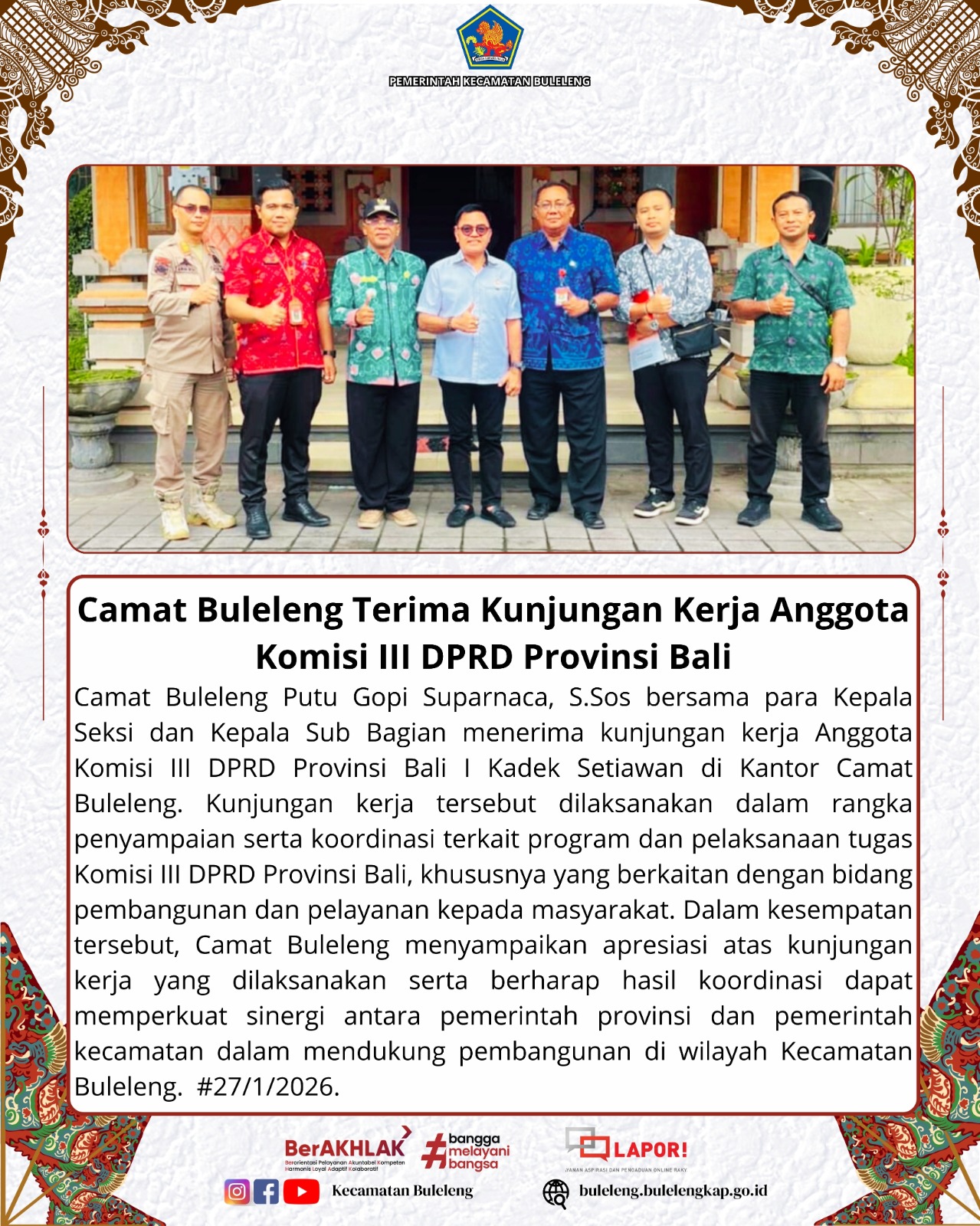 Buleleng — Selasa, 27 Januari 2026, Camat Buleleng Putu Gopi Suparnaca, S.Sos bersama para Kepala Seksi dan Kepala Sub Bagian menerima kunjungan kerja Anggota Komisi III DPRD Provinsi Bali di Kantor Camat Buleleng.
