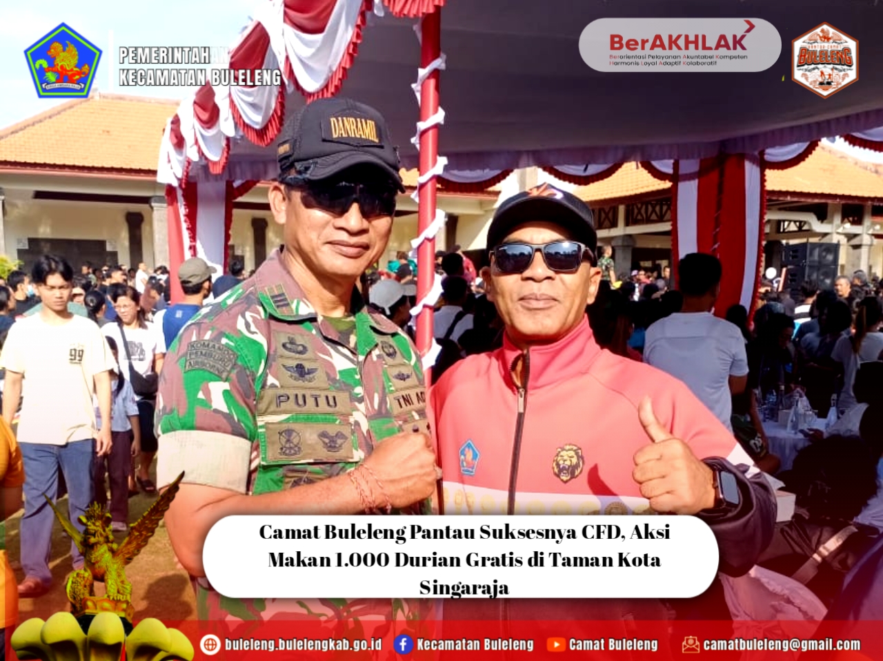 Buleleng, Minggu, 2 Oktober 2025 — Bertempat di Taman Kota Singaraja, Car Free Day (CFD) yang digelar setiap hari Minggu kali ini tampak berbeda. CFD biasanya dimanfaatkan masyarakat buleleng untuk berolah raga seperti kegiatan senam, lari, atau sekedar berjalan santai, kali ini tampak sangat berbeda. Jelas saja, CFD kali ini diisi dengan aksi makan 1000 durian gratis bersama masyarakat Buleleng. Sontak masyarakat Buleleng tidak menyianyiakan kesempatan ini dan secara antusias datang ke Taman Kota untuk sekedar bisa mencicipi buah durian yang menjadi kebanggan Provinsi Bali khususnya Kabupaten Buleleng.