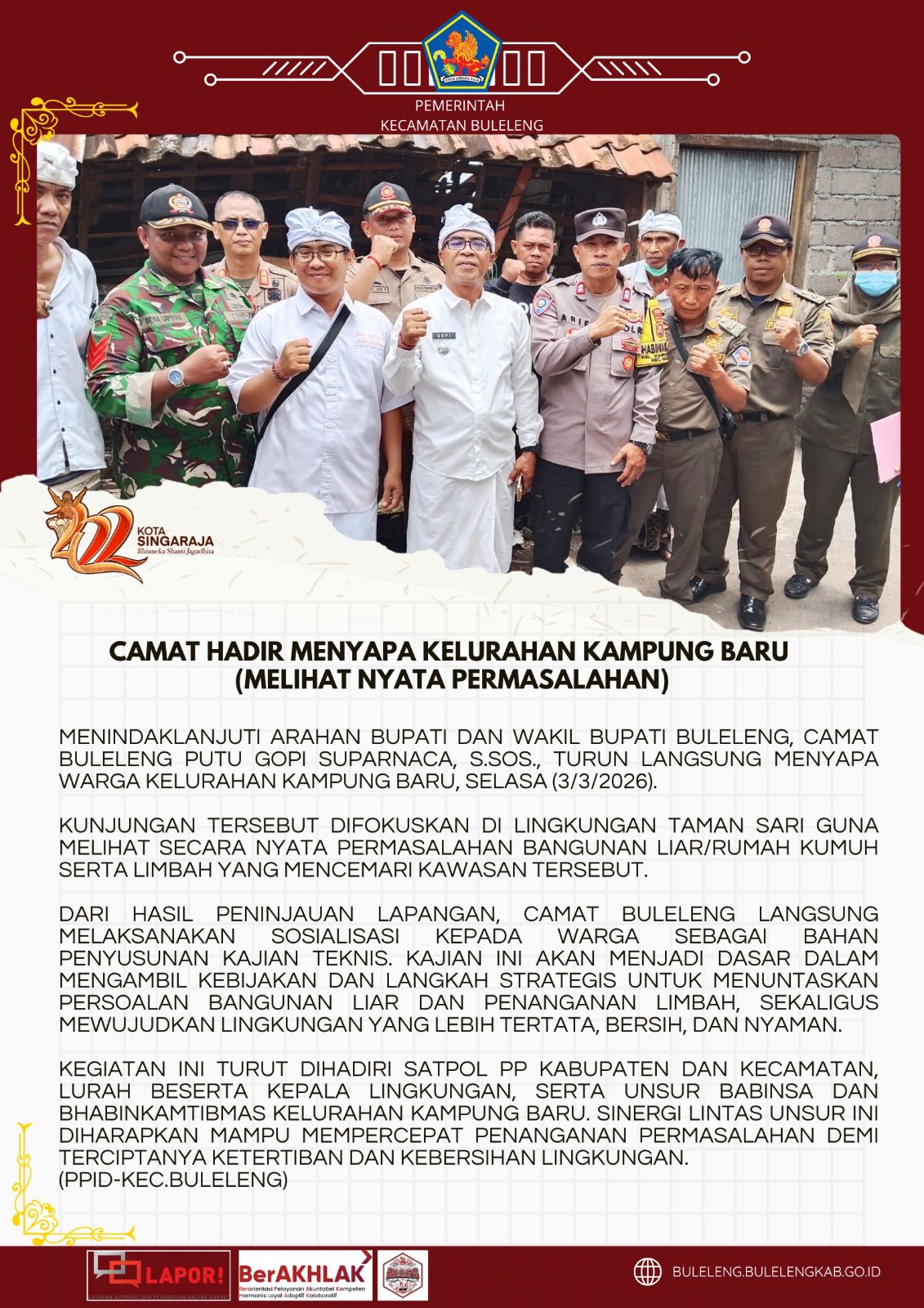 Menindaklanjuti arahan Bupati dan Wakil Bupati Buleleng, Camat Buleleng Putu Gopi Suparnaca,S.Sos., turun langsung menyapa warga Kelurahan Kampung Baru, Selasa (3/3/2026).