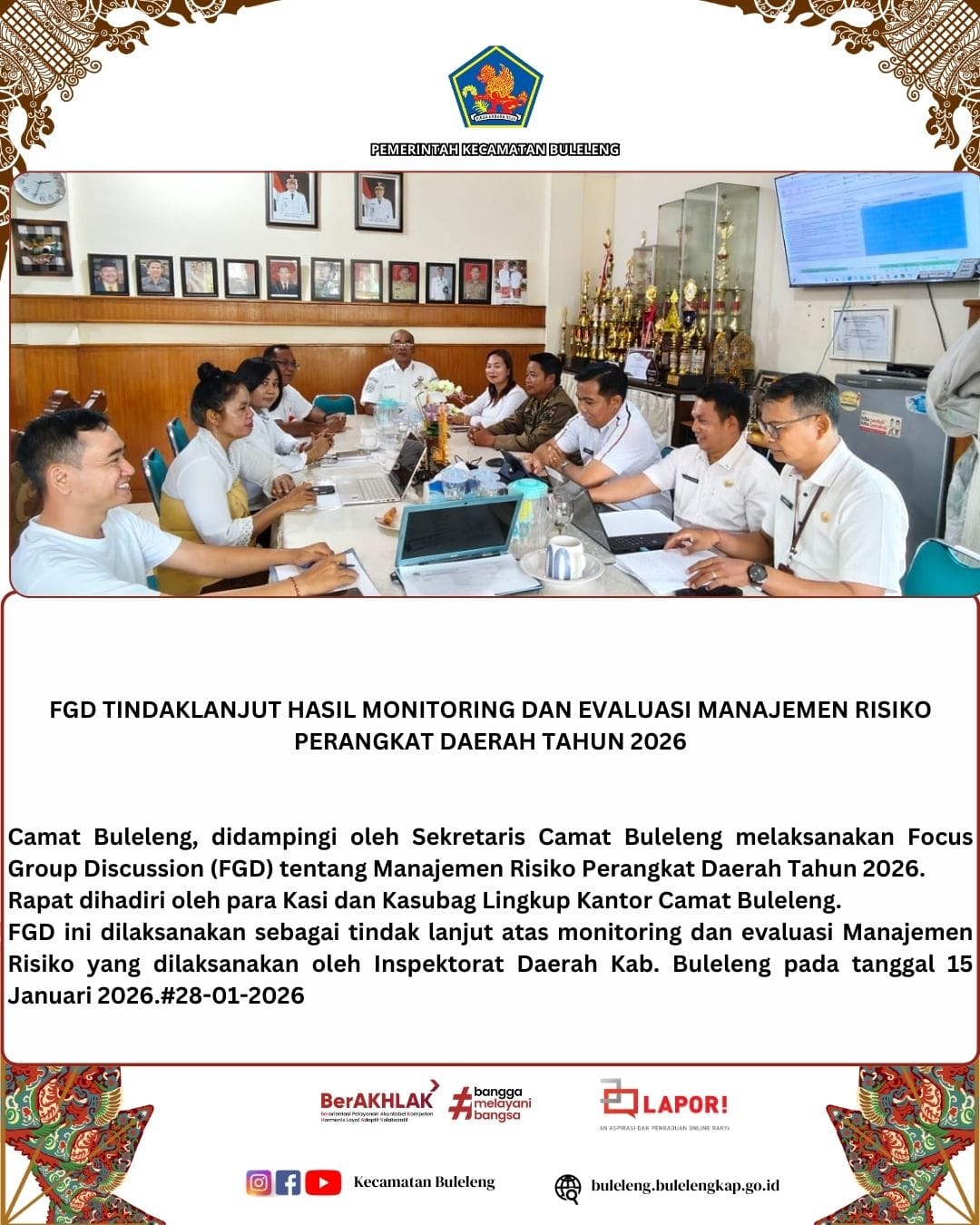 Rabu, 28 Januari 2026, Camat Buleleng Putu Gopi Suparnaca, S.Sos, didampingi Sekretaris Camat Buleleng Ni Putu Sri Sundariani, S.STP., M.E, melaksanakan Focus Group Discussion (FGD) Manajemen Risiko Perangkat Daerah Tahun 2026 yang bertempat di Ruang Kerja Camat Buleleng.
