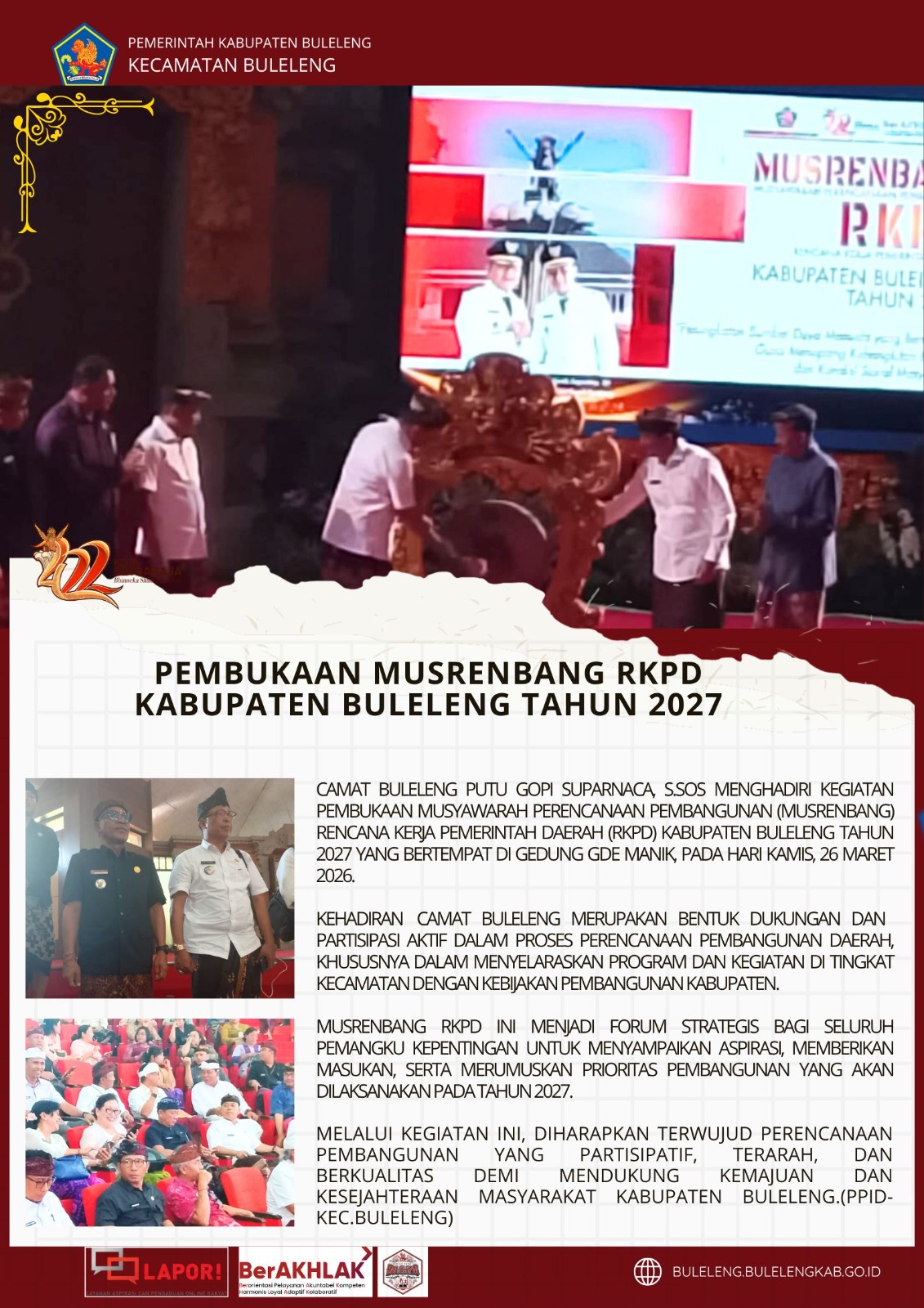 Camat Buleleng Putu Gopi Suparnaca,S.Sos menghadiri kegiatan pembukaan Musyawarah Perencanaan Pembangunan (Musrenbang) Rencana Kerja Pemerintah Daerah (RKPD) Kabupaten Buleleng Tahun 2027 yang bertempat di Gedung Gde Manik, pada hari Kamis, 26 Maret 2026.