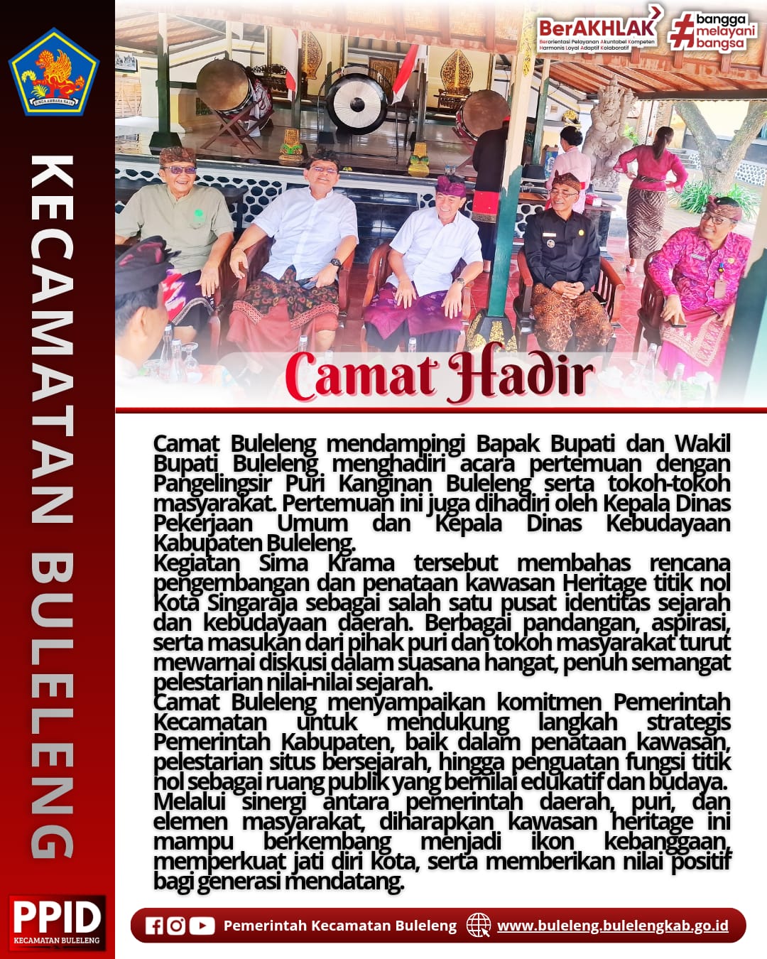 Buleleng – Kamis, 8 Januari 2026, Camat Buleleng Putu Gopi Suparnaca, S.Sos mendampingi Bupati Buleleng dan Wakil Bupati Buleleng menghadiri kegiatan Sima Krama bersama Pangelingsir Puri Kanginan Buleleng serta tokoh-tokoh masyarakat. Pertemuan tersebut turut dihadiri oleh Kepala Dinas Pekerjaan Umum dan Kepala Dinas Kebudayaan Kabupaten Buleleng sebagai bentuk sinergi lintas sektor dalam perencanaan pembangunan daerah.