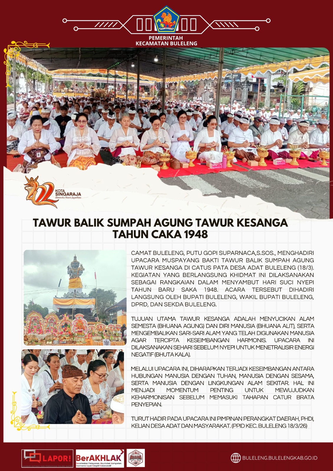 Camat Buleleng, Putu Gopi Suparnaca, S.Sos., menghadiri upacara Muspayang Bakti Tawur Balik Sumpah Agung Tawur Kesanga di Catus Pata Desa Adat Buleleng (18/3). Kegiatan yang berlangsung khidmat ini dilaksanakan sebagai rangkaian dalam menyambut Hari Suci Nyepi Tahun Baru Saka 1948. Acara tersebut dihadiri langsung oleh Bupati Buleleng, Wakil Bupati Buleleng, DPRD, dan Sekda Buleleng.