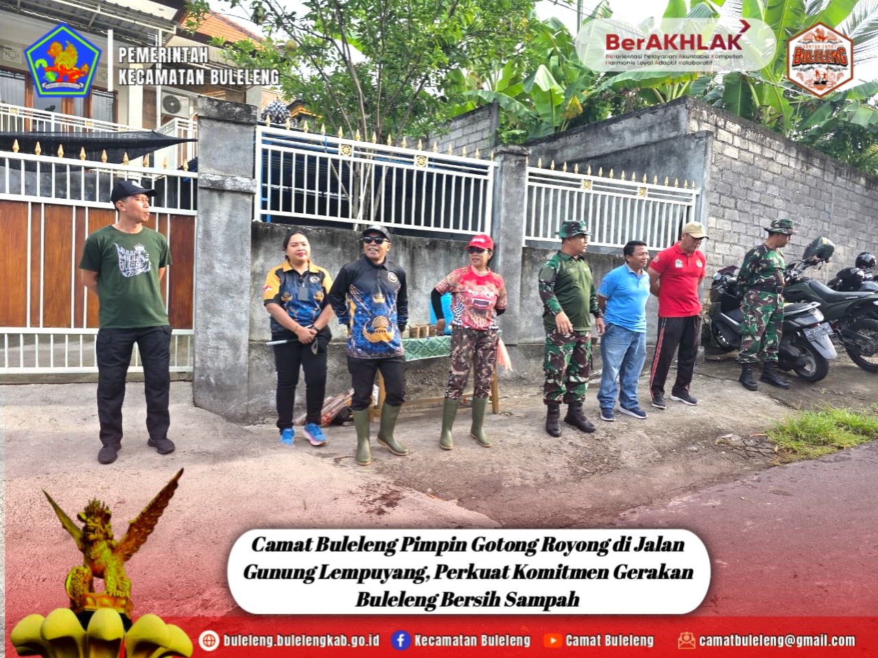 Buleleng, Jumat pagi 12 Desember 2025 — Semangat menjaga kebersihan dan keasrian lingkungan kembali digaungkan melalui aksi gotong royong dalam Gerakan Buleleng Bersih Sampah. Camat Buleleng, Putu Gopi Suparnaca, S.Sos turun langsung ke lapangan didampingi Kepala Seksi Pemerintahan Gede Susena, S.E bersama 10 staf Kecamatan Buleleng. Kegiatan dilaksanakan di Jalan Gunung Lempuyang, tepatnya di area sekitar jembatan menuju RS Balimed, Kelurahan Banjar Tegal.
