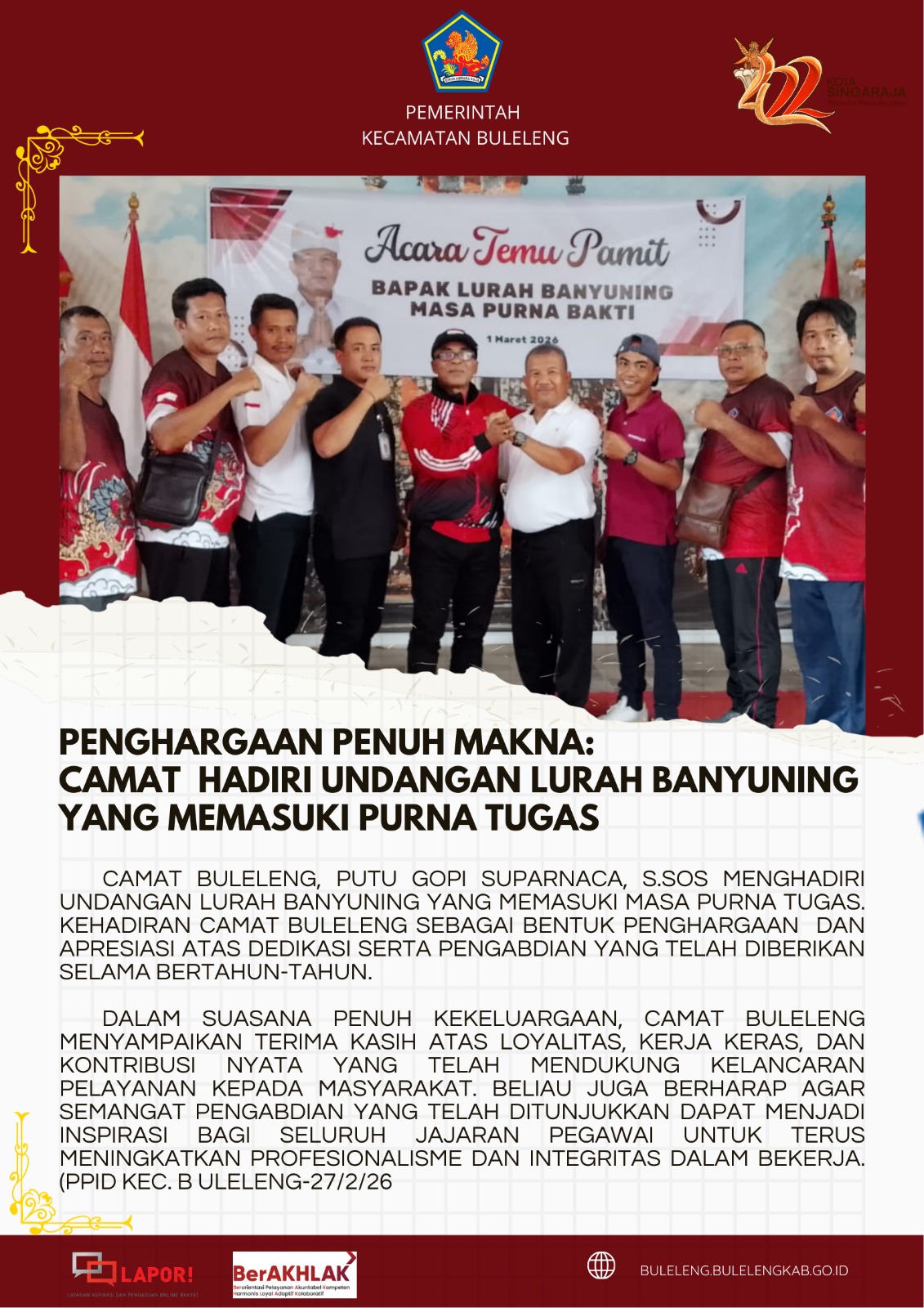 Dalam suasana penuh kekeluargaan, Camat Buleleng menyampaikan terima kasih atas loyalitas, kerja keras, dan kontribusi nyata yang telah mendukung kelancaran pelayanan kepada masyarakat. Beliau juga berharap agar semangat pengabdian yang telah ditunjukkan dapat menjadi inspirasi bagi seluruh jajaran pegawai untuk terus meningkatkan profesionalisme dan integritas dalam bekerja. (PPID Kec. Buleleng–27/2/26.)