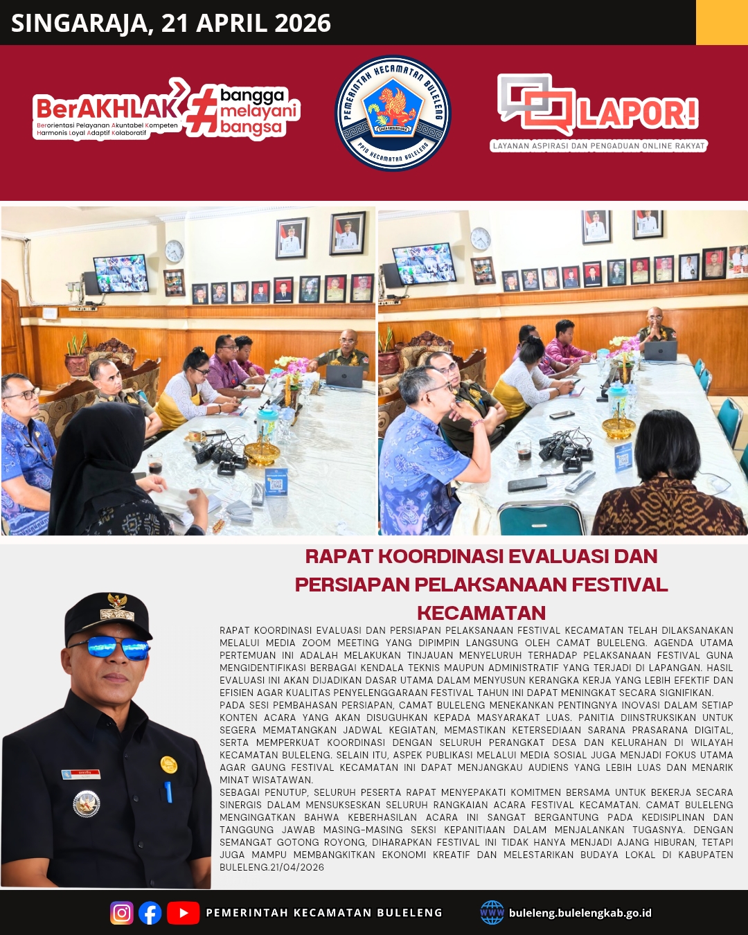 Rapat koordinasi evaluasi dan persiapan pelaksanaan festival kecamatan telah dilaksanakan melalui media Zoom Meeting yang dipimpin langsung oleh Camat Buleleng. Agenda utama pertemuan ini adalah melakukan tinjauan menyeluruh terhadap pelaksanaan festival guna mengidentifikasi berbagai kendala teknis maupun administratif yang terjadi di lapangan.