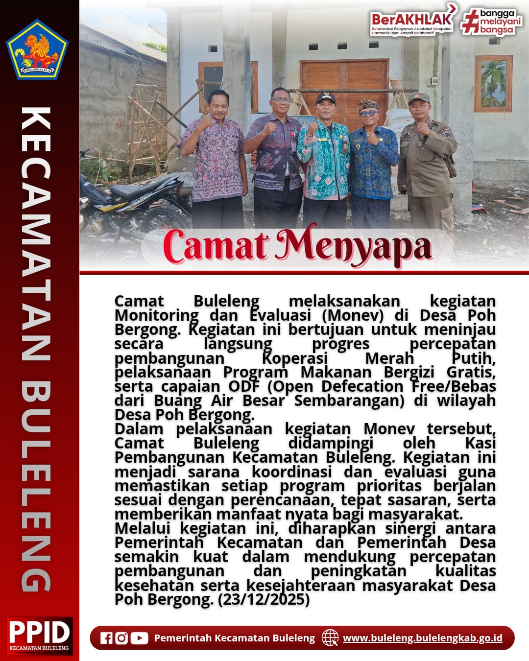 Buleleng, Selasa (23/12/2025) — Camat Buleleng Putu Gopi Suparnaca, S.Sos melaksanakan kegiatan Monitoring dan Evaluasi (Monev) di Desa Poh Bergong sebagai upaya memastikan pelaksanaan program-program prioritas pemerintah berjalan optimal dan tepat sasaran.