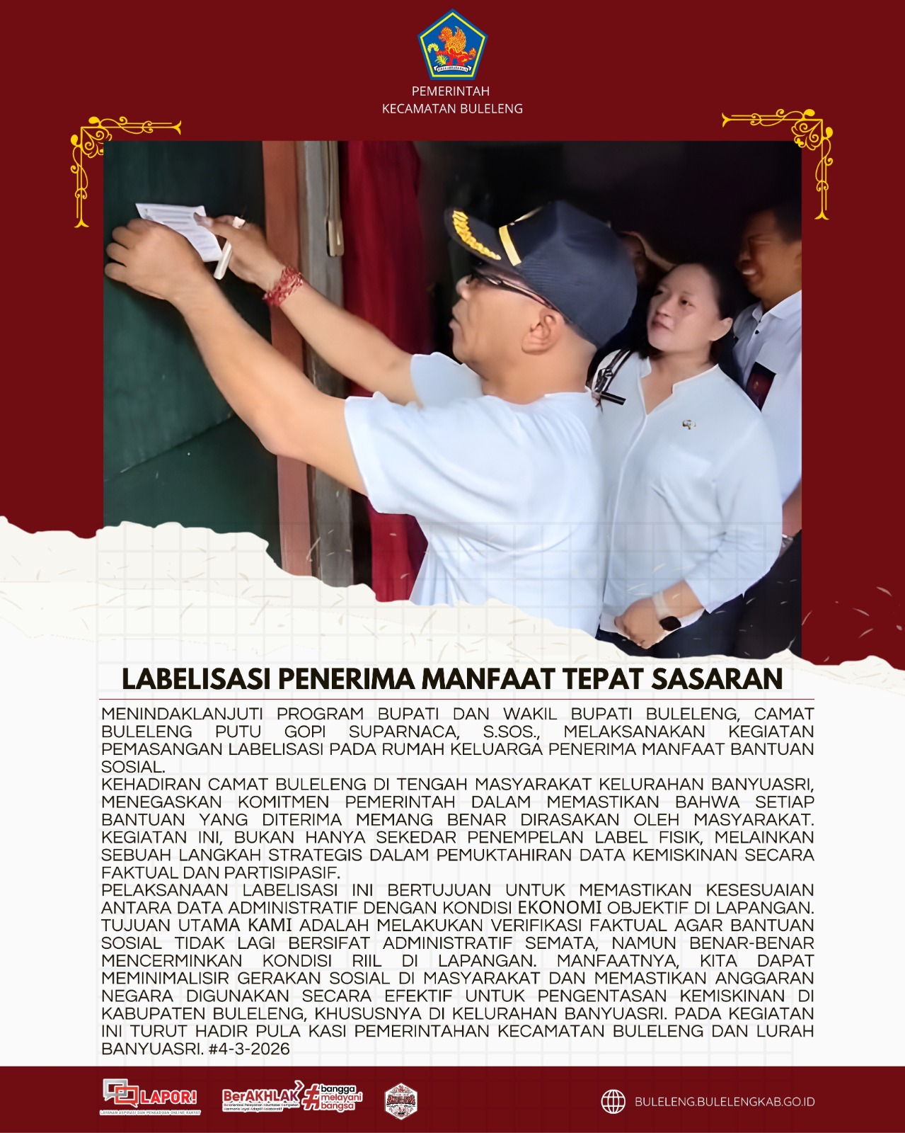 Menindaklanjuti program Bupati dan Wakil Bupati Buleleng, Camat Buleleng Putu Gopi Suparnaca,S.Sos., melaksanakan kegiatan pemasangan labelisasi pada rumah keluarga penerima manfaat bantuan sosial, (4/3).