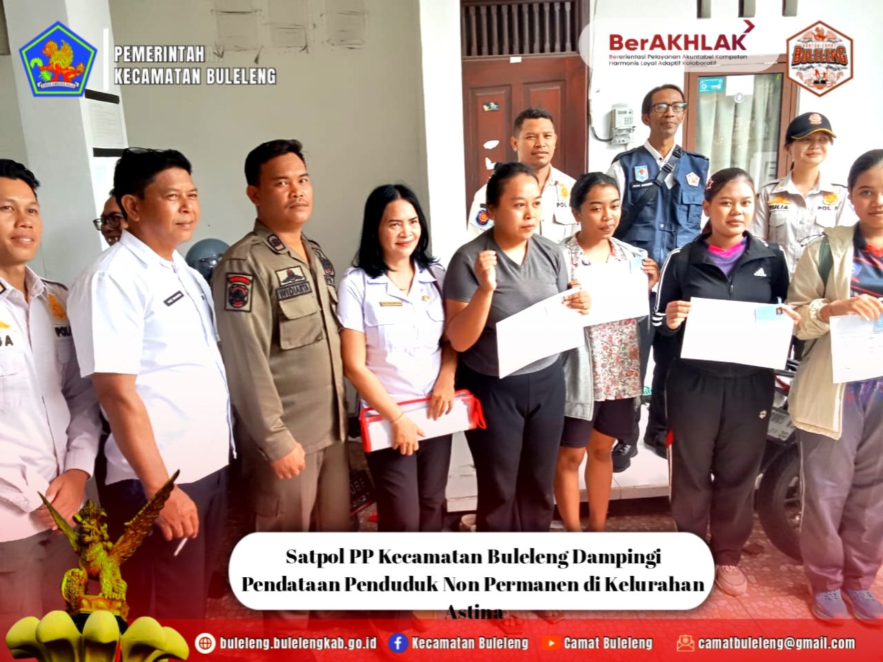 Buleleng, 29 Oktober 2025 — Satuan Polisi Pamong Praja (Satpol PP) Kecamatan Buleleng kembali melaksanakan pendampingan dalam kegiatan Pemantauan dan Pendataan Penduduk Non Permanen (PNP). Kegiatan kali ini berlangsung di wilayah Kelurahan Astina.