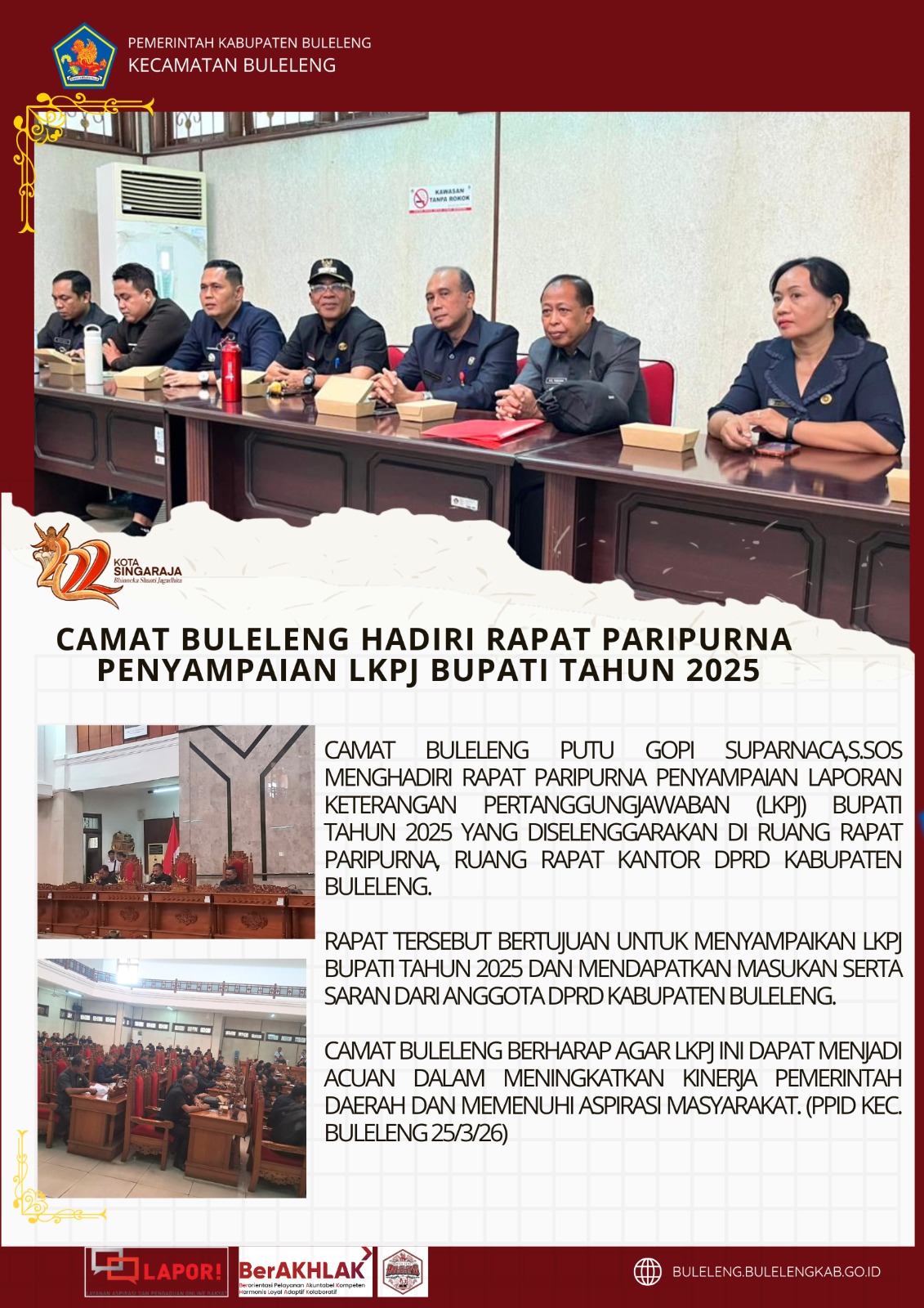 Camat Buleleng berharap agar LKPJ ini dapat menjadi acuan dalam meningkatkan kinerja pemerintah daerah dan memenuhi aspirasi masyarakat. (PPID Kec. Buleleng 25/3/26).