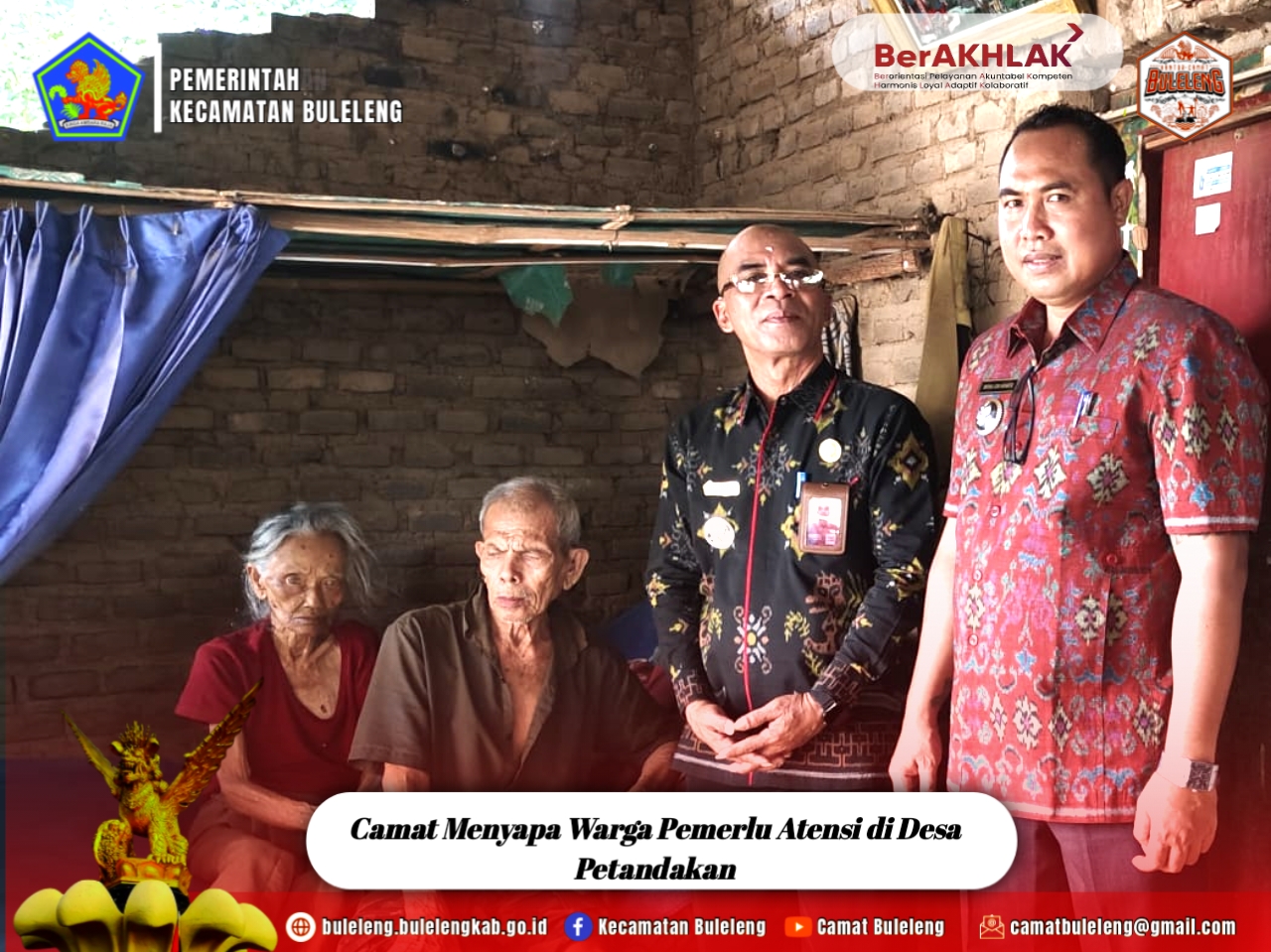 Buleleng, Selasa 2 Desember 2025 – Camat Buleleng Putu Gopi Suparnaca, S.Sos kembali melaksanakan program Camat Menyapa dengan mengunjungi warga pemerlu atensi sosial di Desa Petandakan. Dalam kunjungan tersebut, Camat Buleleng didampingi oleh Perbekel Desa Petandakan, Wayan Joni Arianto, menyambangi dua warga pasangan suami istri lanjut usia penyandang tuna netra, atas nama Ketut Tendra (85 th) dan Luh Putri Asih (80 th) yang beralamat di Banjar Dinas Kawan Desa Petandakan.